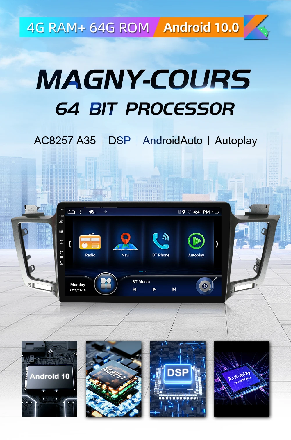 ● Android 10,0● ОЗУ 4 Гб + ПЗУ 64 ГБ● Мощный Процессор: AC8257 Octa core, A53, 2,5 ГГц, 64Bit процессор● Встроенный DSP. Встроенный поп, рок, джаз, классический, плоский, пользовательский, голосовой, звуковой задержки. Несколько вариантов настройки позволяют адаптировать аудио опыт по своему вкусу.● Поддержка быстрой загрузки 3S● Встроенный Android Auto & Apple CarPlay, принимает вещи, которые вы хотите сделать с вашим телефоном во время вождения, и кладет их на встроенный дисплей вашего автомобиля. Вы можете получать указания, совершать звонки, отправлять и получать сообщения, а также слушать музыку, таким образом, чтобы вы могли оставаться сосредоточенными на дороге. Просто подключите телефон и перейдите. Вы также можете использовать управление рулевым колесом.● Поддержка панорамной функции 360 градусов, HD 3D 360 ° панорамная, чтобы сделать вас более безопасным вождением и легким задним ходом. (необходимо дополнительно купить 4 камеры AHD для поддержки)