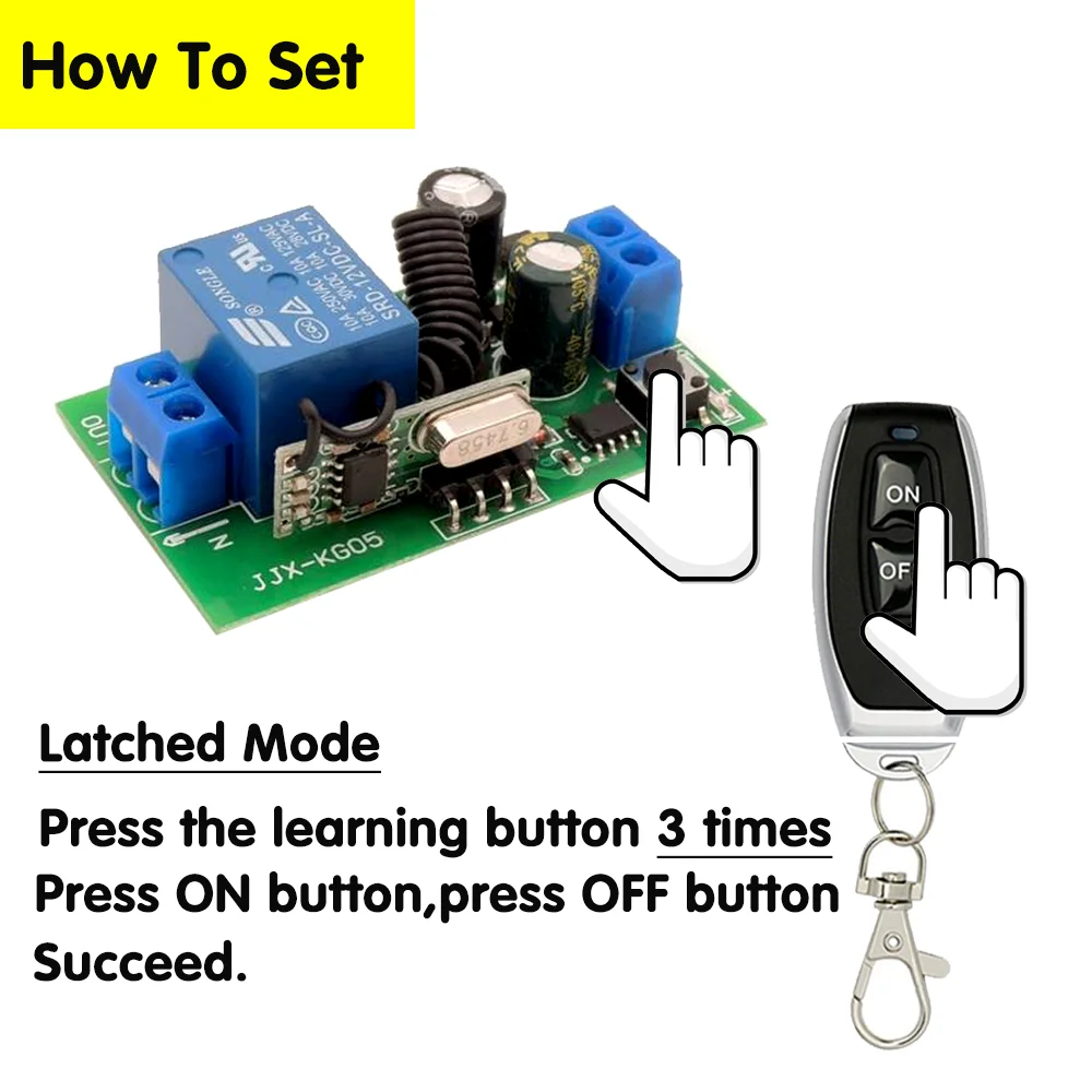 Режимы работы Вы можете настроить в 3 Режимах: Мгновенный режим, режим переключения и режим блокировки. Мгновенный режим: Нажмите и удерживайте кнопку, это реле будет работать; Отпустите кнопку, это реле остановится. Режим переключения: Нажмите кнопку, реле будет работать; Нажмите кнопку снова, это реле остановится. Режим блокировки: Нажмите кнопку, реле будет работать; Нажмите кнопку B снова, это реле остановится, второе реле будет работать. Как настроить Мгновенный режим: Нажмите кнопку обучения один раз, нажмите кнопку один раз, добиться успеха. Режим переключения: Нажмите кнопку обучения дважды, нажмите кнопку один раз, добиться успеха. Режим блокировки: Нажмите кнопку обучения 3 раза, нажмите кнопку один раз, добиться успеха. Чистые данные: Нажмите кнопку обучения 8 раз, данные будут очищены. Все пульты не могут контролировать этот приемник. Если вы хотите изменить режимы, вам нужно сначала очистить данные.