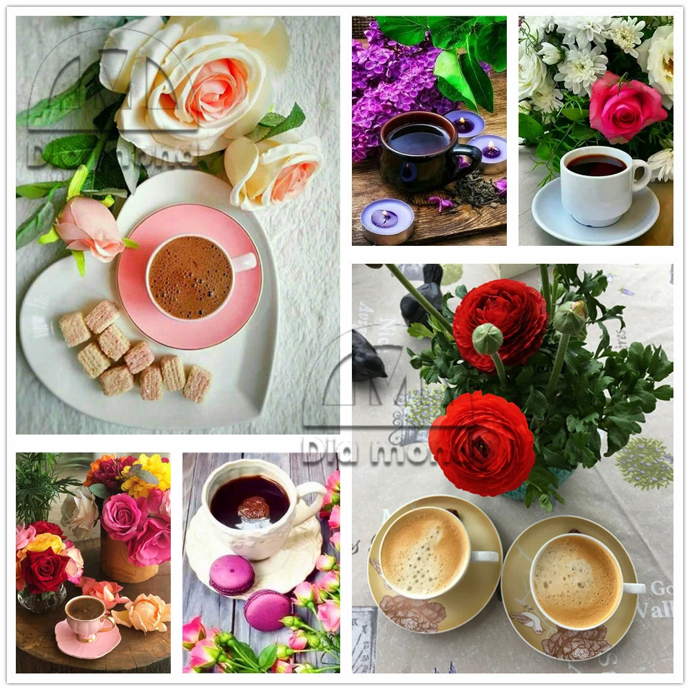 Картина кофейный чай, кухонный декор, полная вышивка стразами, вышивка крестиком, картина Стразы с цветами