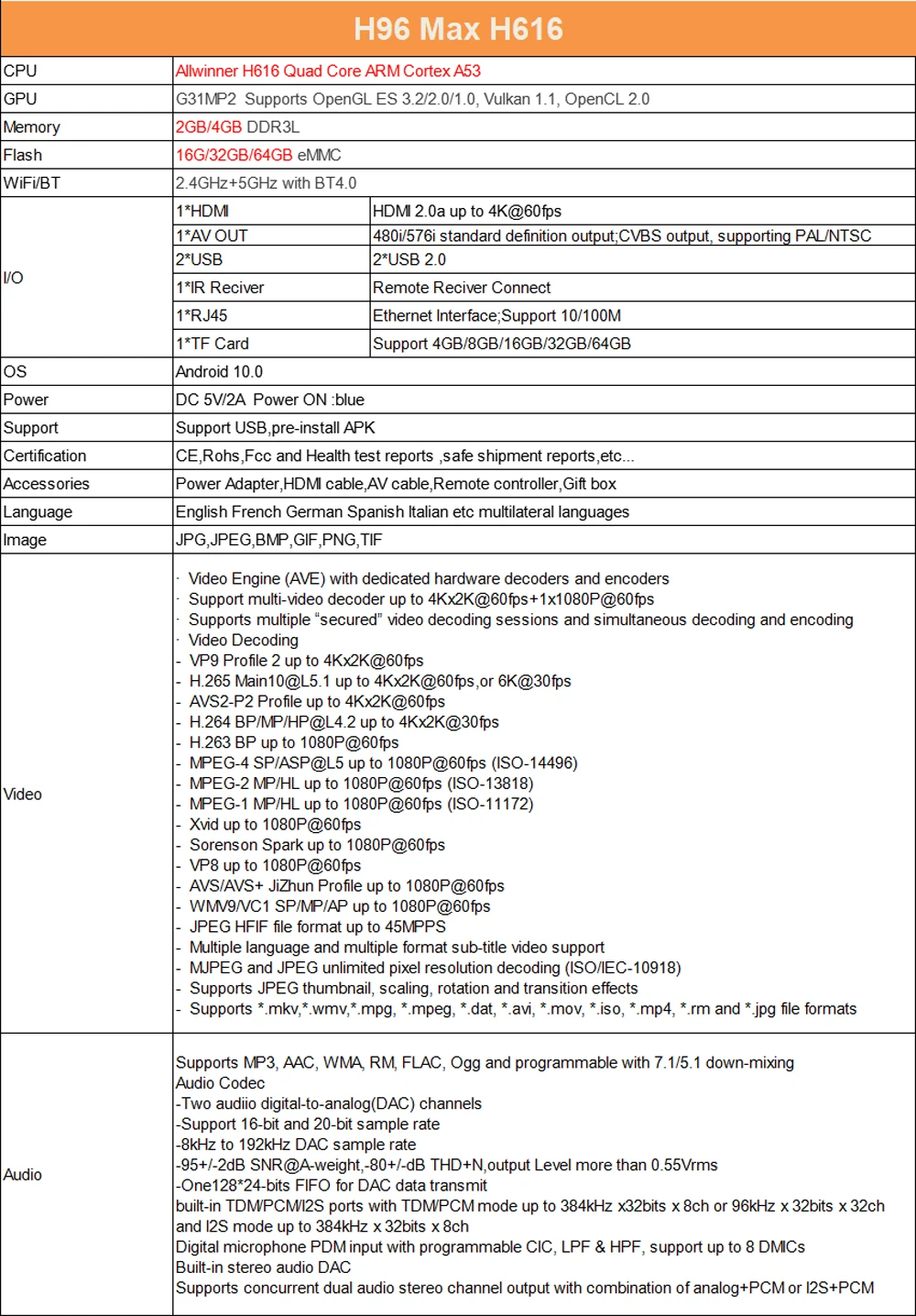 * Процессор: H616 четырехъядерный cortex-A53* GPU: G31MP2 поддерживает OpenGL ES 3,2/2,0/1,0, Vulkan 1,1, OpenCL 2,0* O.S: Android 10,0 новейшая Android телеприставка, более стабильная, безопасная и более Энергоэффективная* Память: RAM 4G ROM 32G/64G* Беспроводной: 2,4G и 5,8G Wifi* USB: 2 типа A USB2.0* Поддержка Bluetooth: BT4.0* LAN Ethernet:10/100 м Стандартный RJ-45* HDMI-Совместимость: HDMI 2.0a до 4K @ 60fps* 3D: жесткое 3D Графическое ускорение* Поддержка формата декодера:-Профиль VP9 2 до 4K x 2K @ 60fps-H.265 Main10@L5.1 до 4K x 2K @ 60fps, или 6K @ 30fps-AVS2-P2 профиль до 4K x 2K @ 60fps-H.264 BP/MP/HP@L4.2 до 4K x 2K @ 30 кадров в секунду-H.263 BP до 1080P @ 60fps-MPEG-4 SP/ASP @ L5 до 1080P @ 60fps (ISO-14496)-MPEG-2 MP/HL до 1080P @ 60fps (ISO-13818)-MPEG-1 MP/HL до 1080P @ 60fps (ISO-11172)-Xvid до 1080P @ 60 кадров в секунду-Sorenson Spark до 1080P @ 60fps-VP8 до 1080P @ 60 кадров в секунду-AVS/AVS + JiZhun профиль до 1080P @ 60fps-WMV9/VC1 SP/MP/AP до 1080P @ 60fps-Формат файла JPEG HFIF до 45MPPS* Мышь/Клавиатура: Поддержка Мышь и клавиатуры через USB; Поддержка 2,4 ГГц беспроводной Мышь и клавиатура через 2,4 ГГц USB донгл* Язык: английский, русский, французский, немецкий, испанский, итальянский и т. Д.* Есть три варианта коробки H96 MAX H616:2 ГБ 16 ГБ Android 10,0 4k @ 60 Гц 2,4G и 5,8G Wifi4 ГБ 32 ГБ Android 10,0 4k @ 60 Гц 2,4G и 5,8G Wifi4 ГБ 64 ГБ Android 10,0 4k @ 60 Гц 2,4G и 5,8G Wifi