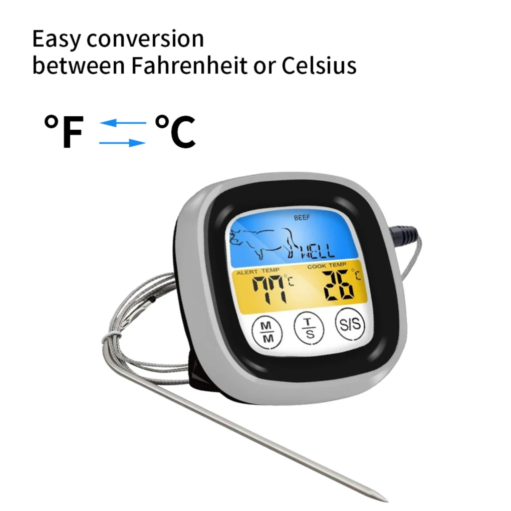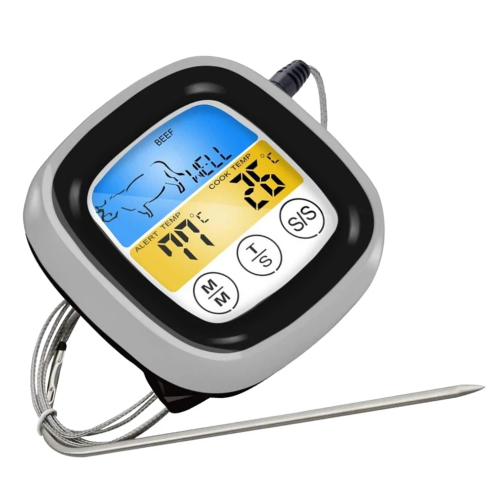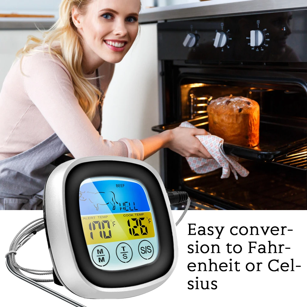 Сенсорный экран термометр для мяса может установить температуру, чтобы идеально готовить все виды мяса и других продуктов питания.Кухонный Электронный температурный датчик является программируемым режимом, вы можете установить свою собственную специфическую температуру.Кухонный Электронный температурный датчик может легко преобразовывать Фаренгейт или температуру Цельсия.Термометр для приготовления пищи имеет переключатель таймера, а также может использоваться в качестве таймера обратного отсчета.Задняя крышка термометра для барбекю имеет подставку, которая удобна для крепления на железной мебели или на подставке, и поставляется с запасным зондом.