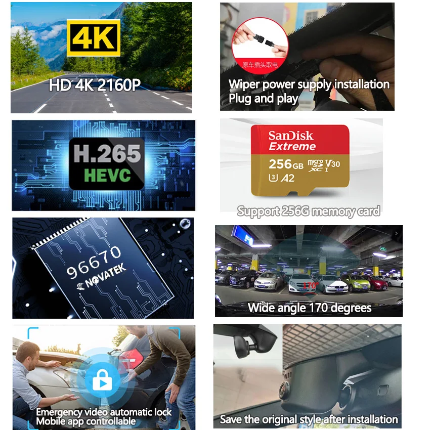 2160p full hd Автомобильный видеорегистратор Wifi видеорегистратор камераПроцессор: Novatek 96670Датчик камеры: SONY MX307Камера Размер сенсора: 1 / 29 НЧСтандарт кодирования видео: H. 265SD карта памяти: 8-128-256.максимальная Поддержка 256G TF картаПроцессор GImage: WDR & HDR