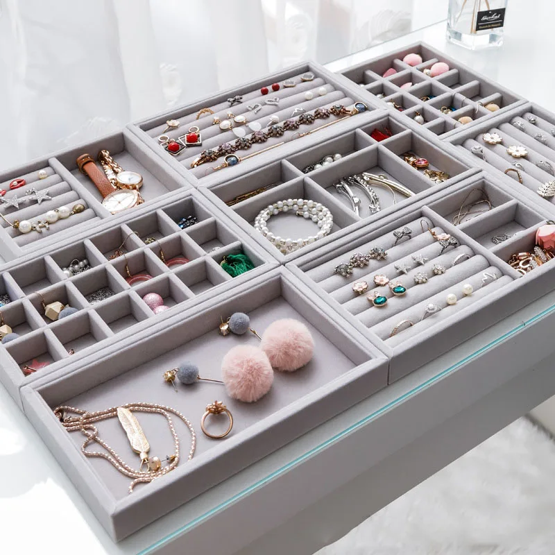 Серый бархатный Штабелируемый органайзер для ювелирных изделий, поднос для украшений, Лидер продаж, модный портативный органайзер для ювелирных изделий из бархата