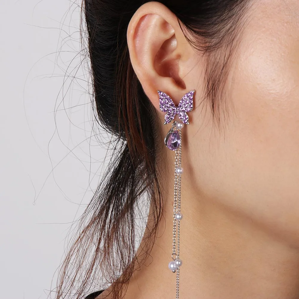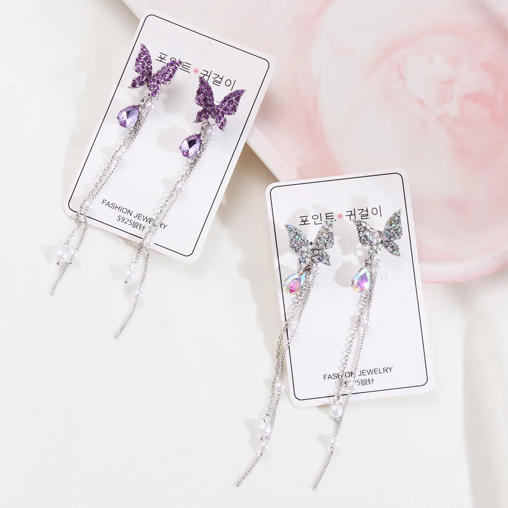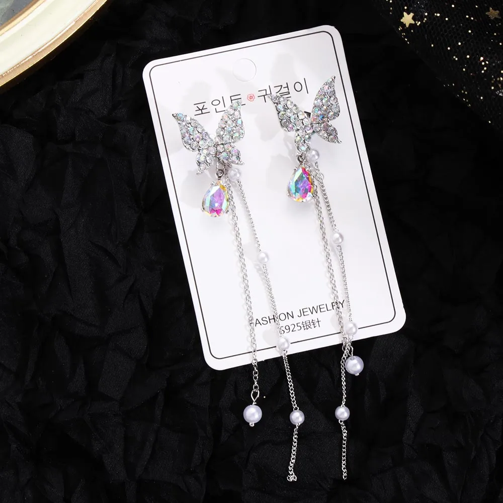 1 пара модные блестящие Висячие серьги Стразы в виде бабочки женские элегантные длинные жемчужные бриллианты ювелирные изделия для вечеринки
