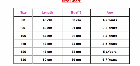 Размеры Длина Бюст * 2 Возраст 80 40 см 30 см Для детей от 1 до 2 лет 90 42 см 31 см От 2 до 3 лет 100 44 см 32 см От 3 до 4 лет 110 46 см 33 см От 4 до 5 лет 120 48 см 34 см 5-6Years 130 50 см 36 см От 6 до 7 летРазница в 2-3% в соответствии с измерениями вручную. Прежде чем купить эту товарную позицию, просим тщательно свериться с таблицей размеров. 1 дюйм = 2,54 см Пожалуйста, обратите внимание на то, что размеры s светильник разница в цвете, это может быть связано с положением источника светильник и цветопередаче экранов