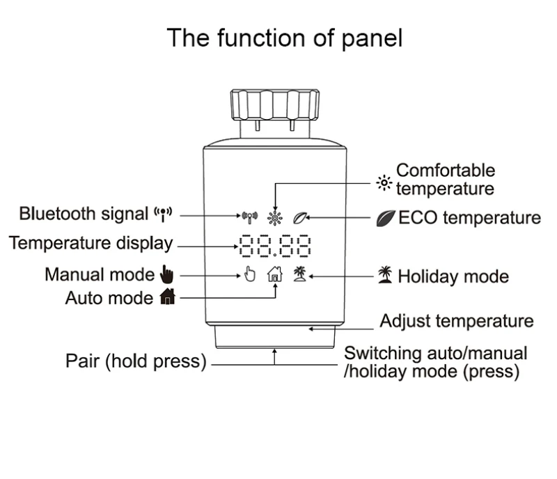 5. Обнаружение открытого окна: когда температура в помещении неожиданно падает в темп. Порог, клапан закроется в течение 15 минут. После этого, если температура в помещении. Все еще ниже, чем температура. Порог, он сохранит этот режим. Кроме того, его легко читать цифровой дисплей с температурой Цельсия.