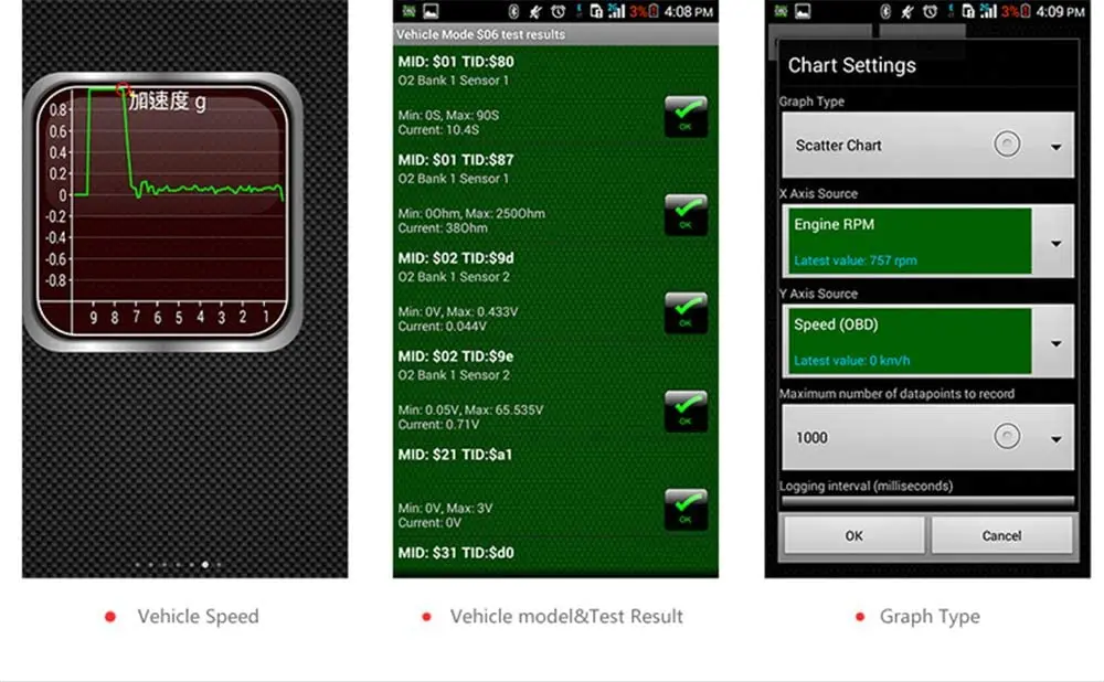 1: Чтение диагностических кодов неисправностей, как общих, так и конкретных производителей, и отображение их значения (более 3000 общих кодов в базе данных). 2: Очистите коды неисправностей и выключите светильник MIL ("Проверьте двигатель") 3: Отображение данных датчика тока, включая: 4: двигатель об/мин 5: расчетное значение нагрузки 6: температура охлаждающей жидкости 7: состояние топливной системы 8: скорость транспортного средства 9: КРАТКОСРОЧНАЯ топливная отделка 10: долгосрочная топливная отделка 11: давление впускного коллектора 12: предоплата времени 13: температура впускного воздуха 14: расход воздуха 15: Абсолютное Положение Дроссельной заслонки 16: напряжение датчика кислорода/соответствующая краткосрочная топливная планка 17: состояние топливной системы 18: давление топлива 19: многие другие