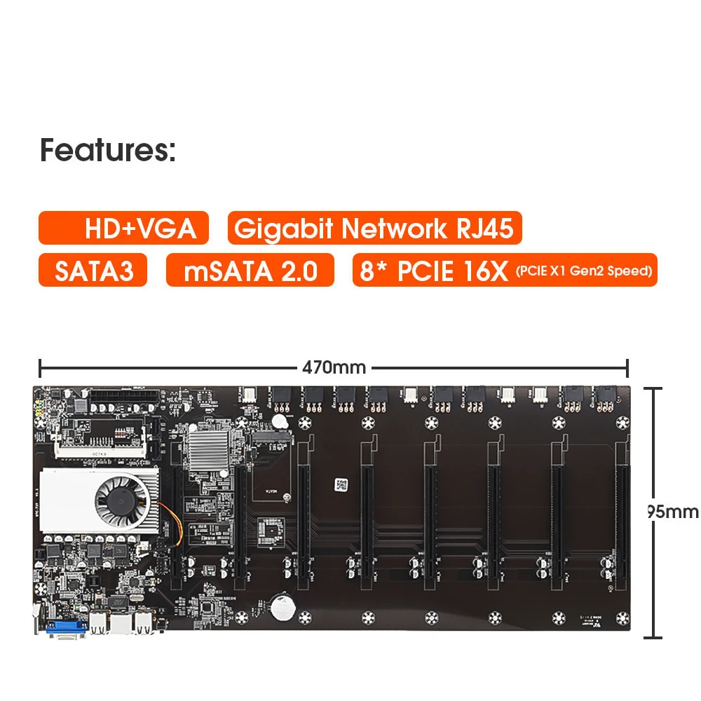 BTC-S378 * PCIE 16X слоты для видеокарт, 575 мм интервал.Высокая производительность вычислений, на 10% выше, чем Материнские платы того же уровня.Оснащен слотом памяти Sodimm DDR3, разъем питания 8*6pin PCIE X16, что значительно повышает производительность материнской платы.Стабилизирующий конденсатор напряжения может обеспечить стабильное напряжение для вашего оборудования электропитания.Он может обеспечить тихую производительность, низкое энергопотребление, меньшее количество тепла, энергосбережение и безопасное использование.Характеристики:Наименование товара: материнская плата для горнодобывающей машиныМодель: BTC-37Цвет: черный + синийРазмер: 575x195 ммПамять: 1 * DDR3 Sodimm слот, поддержка 1066/1333/1600 МГцХранение: 1 * SATA3.0 + 1 * SATA2.0 + 1 * m SATA2.0USB: 4 * USB2.0Сетевой порт: гигабитный сетевой порт RJ45Расширяемый порт: 8 * PCIE 16X,8*6pin PCIE X16 разъем питания, HDMI-совместимый + VGAПримечание:-Возможны небольшие погрешности в размере при ручном измерении.-Отклонение цвета может отличаться из-за различных настроек монитора, пожалуйста, поймите