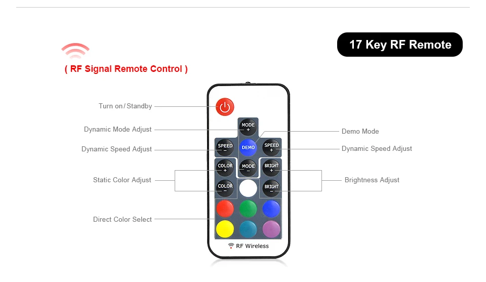 Пульт дистанционного управления 2,4G RF1. Размер: 110*52*20 мм2. Питание: аккумулятор AAA * 2 шт.3. Материал: АБС-пластик4. Изготовление: многоцветная печать и УФ-лак