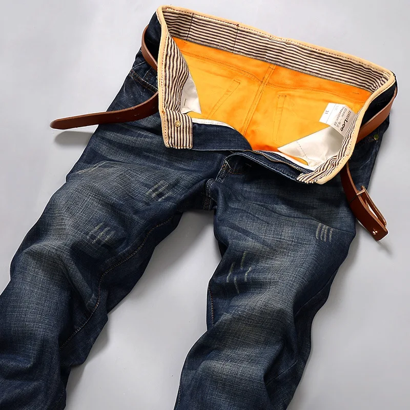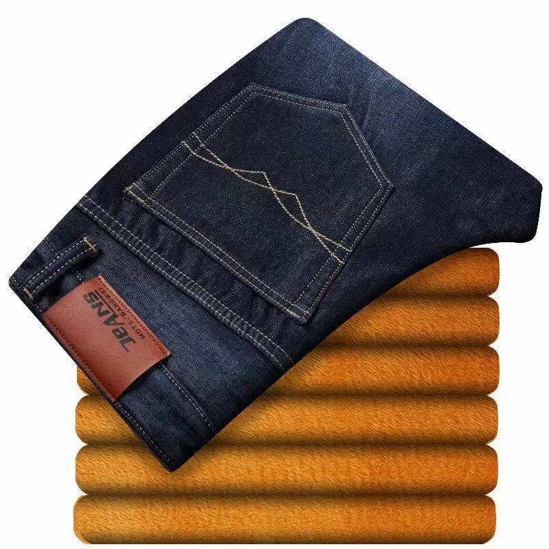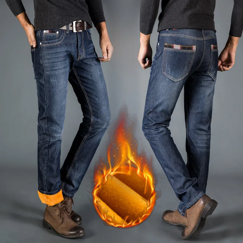 Мужские осенне-зимние флисовые строченные хлопковые джинсовые брюки в клетку с карманамимужские повседневные облегающие брюки