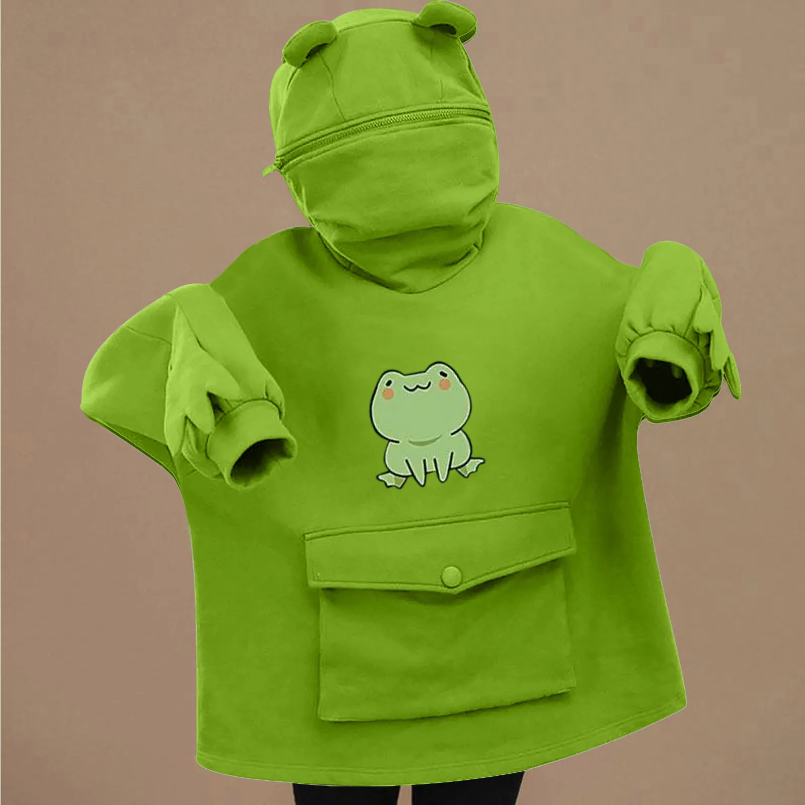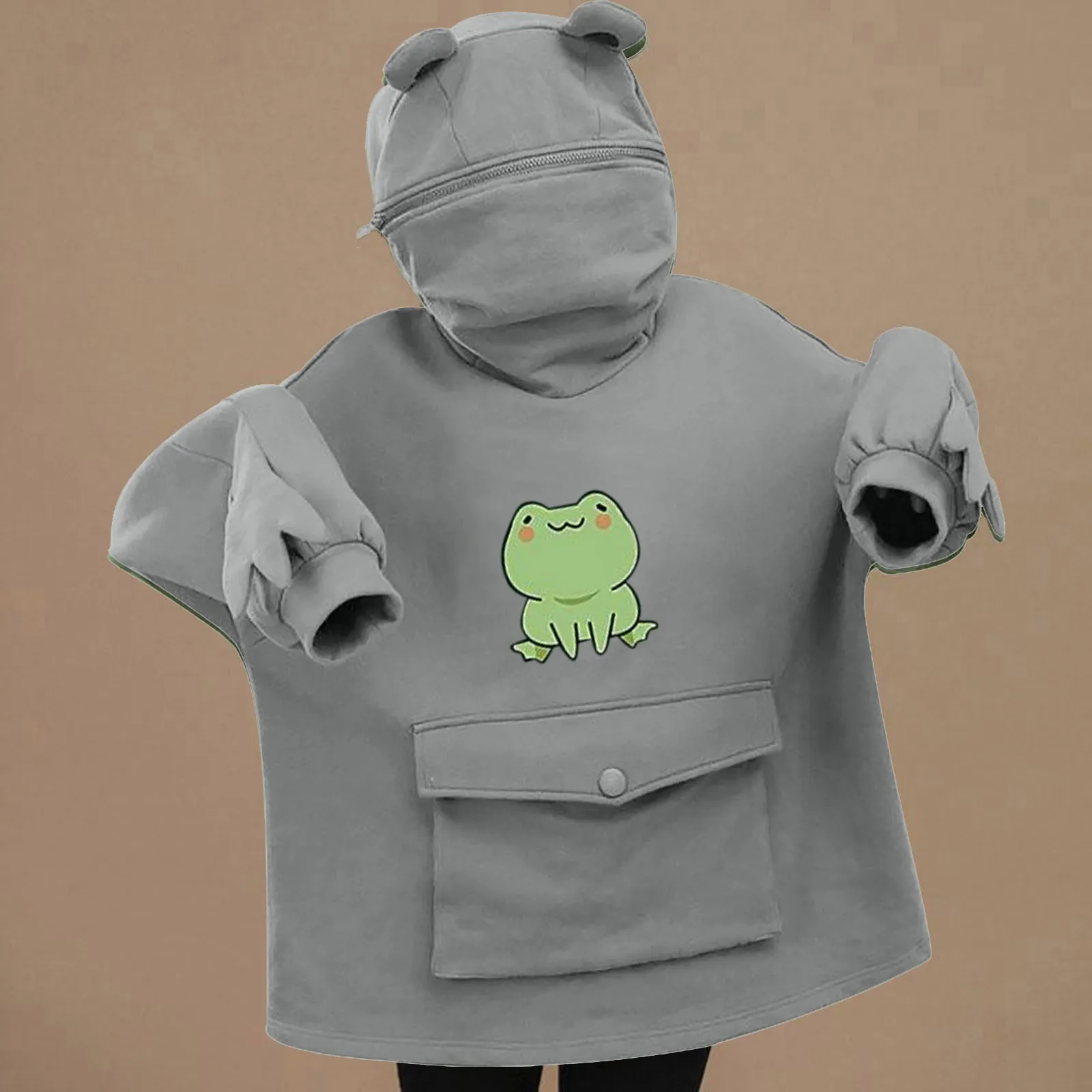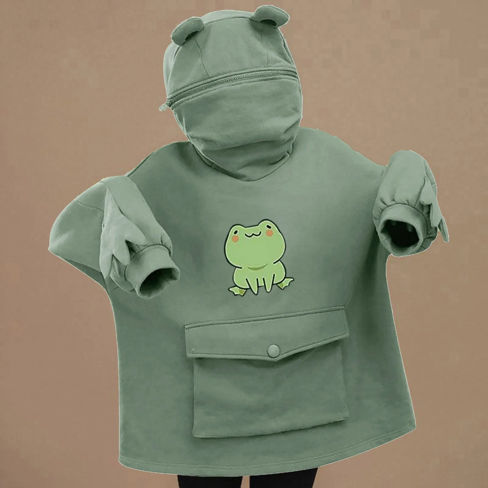 Женский пуловер с капюшоном, на молнии, с лягушкой, с большими карм...