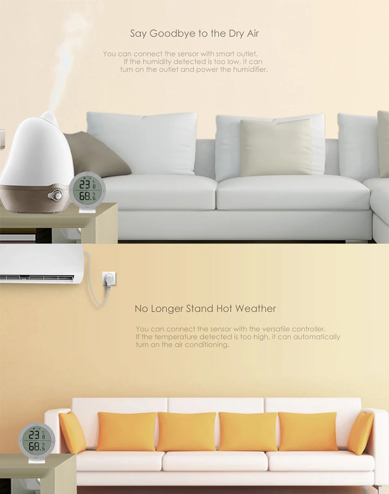 Датчик температуры и влажности-это датчик низкой мощности, который определяет температуру и влажность в окружающей среде и реализует цифровой выход. Он также поддерживает ненормальные напоминания. Когда температура и влажность будут отличаться от комфортного диапазона, приложение получит информацию. Он может управлять другими интеллектуальными аппаратными продуктами через соединение устройства шлюза, такими как гибкое управление интеллектуальными кондиционерами воздуха, умными увлажнителями, умными системами свежего воздуха и другим оборудованием.