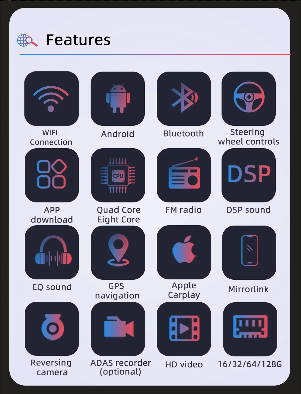 Примечание: пожалуйста, свяжитесь с нами, чтобы предоставить модель и год вашего автомобиля, и предоставьте фотографию вашего оригинального автомобильного радио, чтобы мы могли подтвердить рамку, если вы не можете найти плеер, подходящий для вашего автомобиля, вы можете связаться с нами, и мы порекомендуем вам правильный плеер!