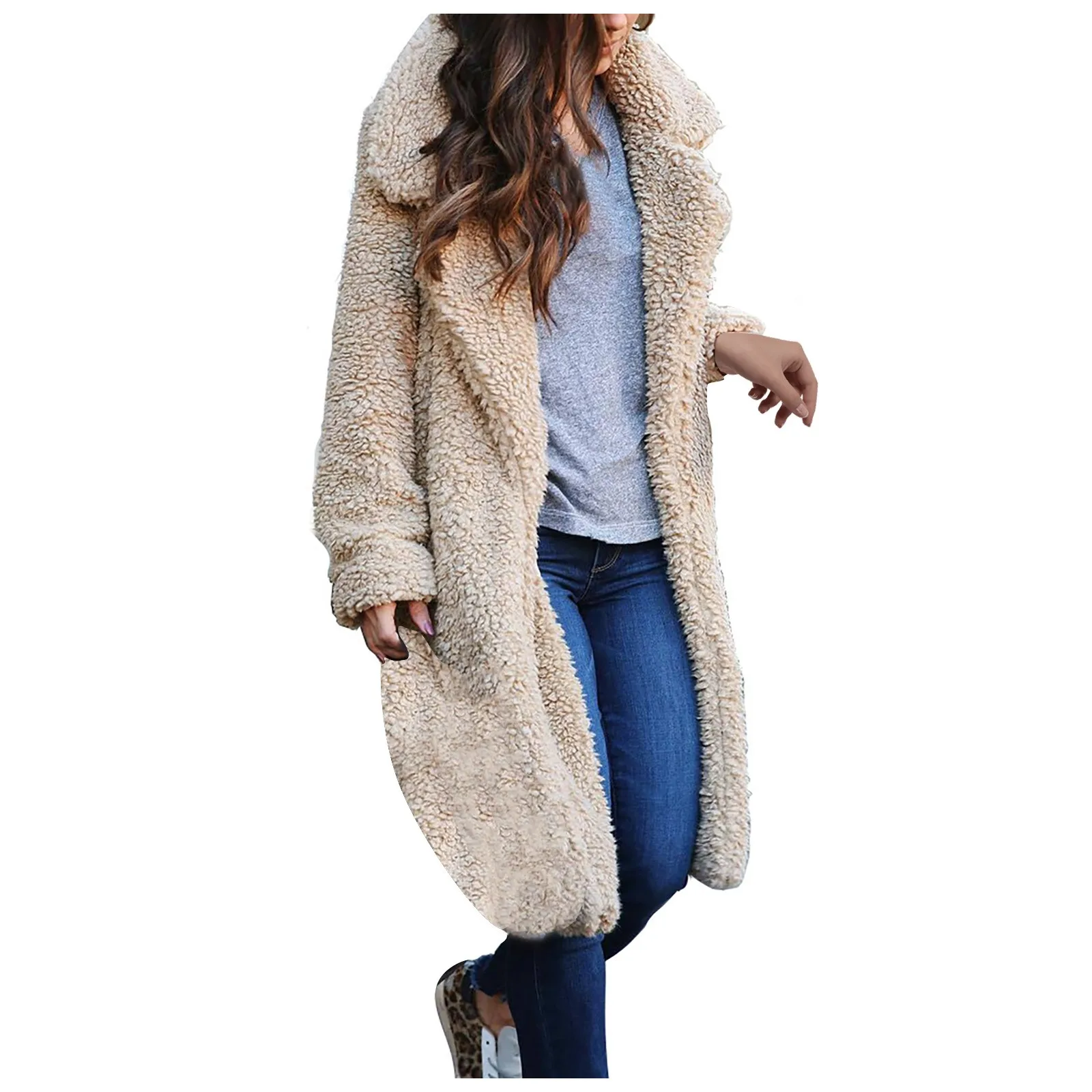 Осенне-зимнее женское бежевое плюшевое пальто из искусственного мех...