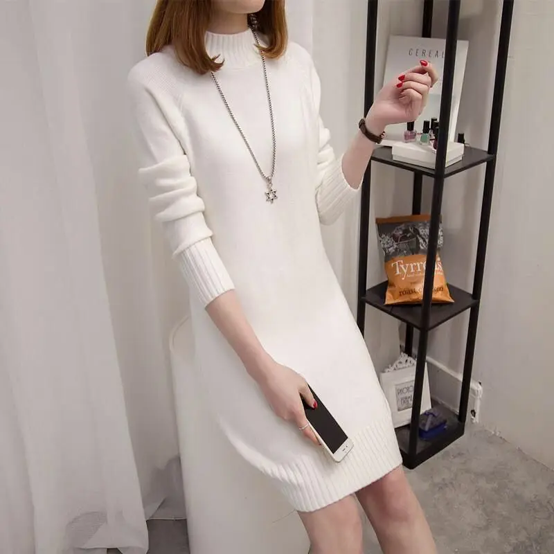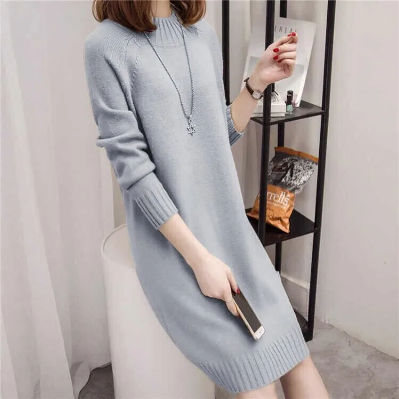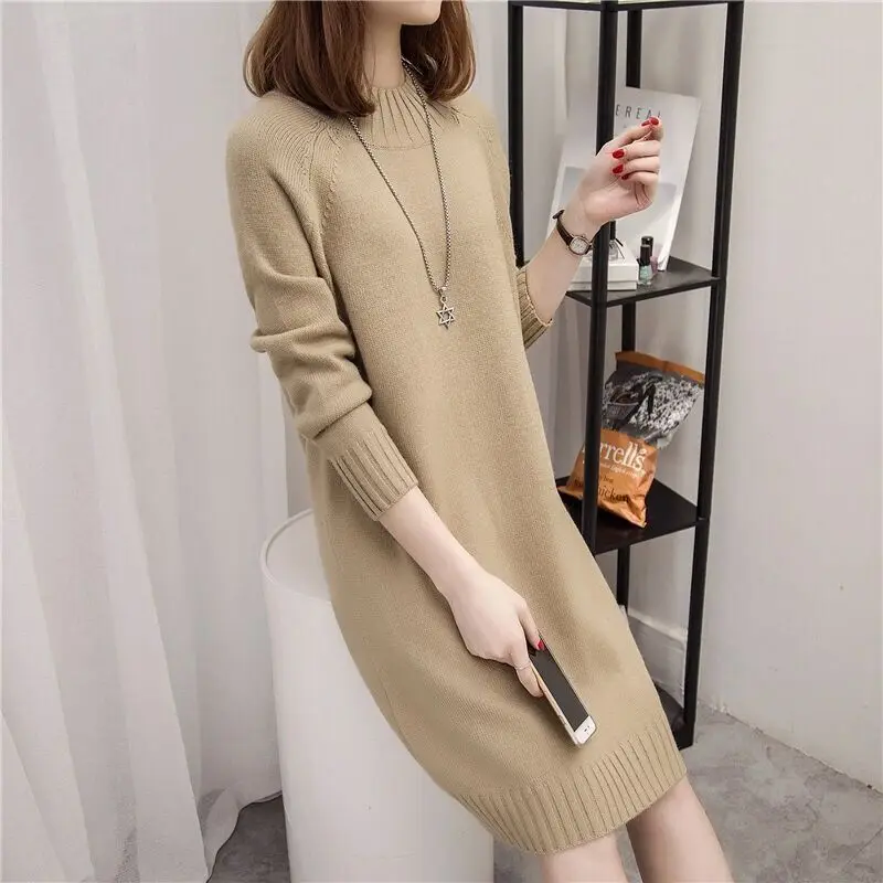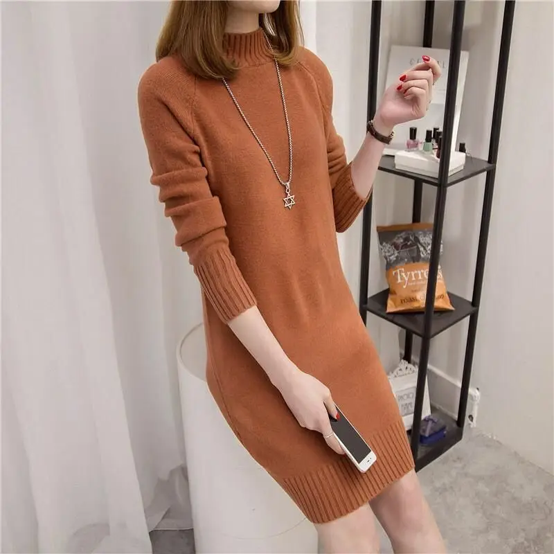 Женское трикотажное платье-свитер с высоким воротником и длинным рукавом