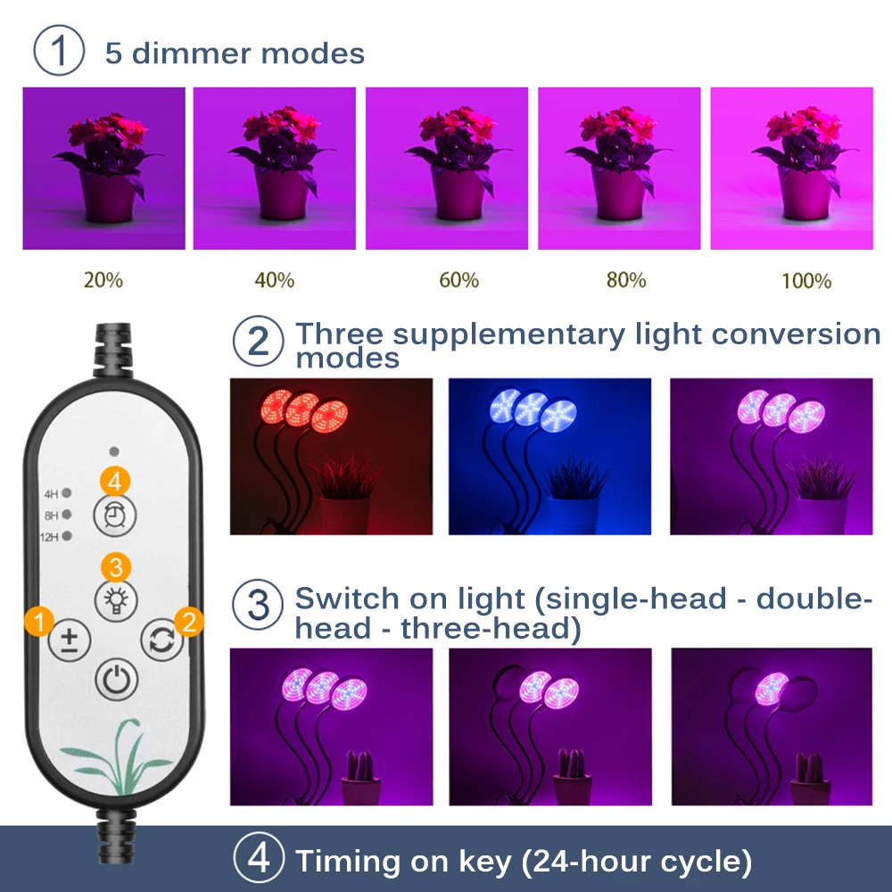 Пятью уровнями светильник режимов может быть отрегулировано, а также есть 3 заполнить светильник преобразования режима, который может эффективно контролировать светильник источник и увеличить соответствующую светильник для того, чтобы удовлетворить потребности растений в различных этапах роста.