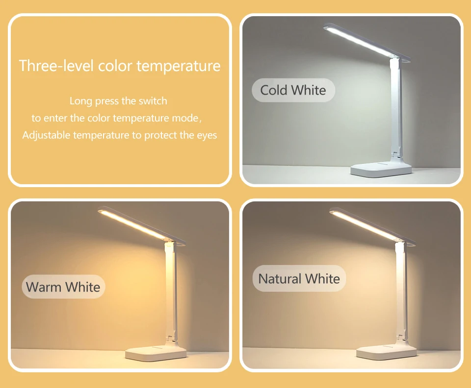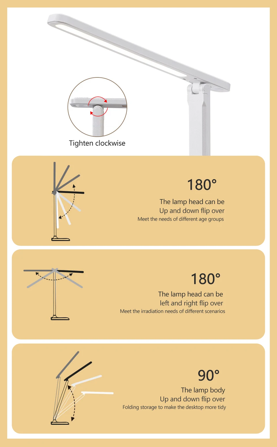 Этот настольный светильник s с 3 пользовательскими уровнями яркости для работы, учебы, чтения или отдыха. Низкое энергопотребление, высокая эффективность и энергосбережение, отсутствие мерцания, отсутствие бликов, мягкий светильник, осветите ваше пространство и Защитите глаза. Отлично подходит для дома, офиса, колледжа, школы; Базовый стиль для мужчин, женщин, подростков, детей, студентов. Светодиодный настольный светильник с регулируемой ручкой и не занимает много места на вашем столе. Когда он не используется, вы можете сложить его на плоской подошве и легко разместить его на полках, сумках, чемоданах, настольных ящиках и других местах. Настольная лампа поставляется с 12-месячной Гарантией и пожизненная техническая поддержка. Если у вас есть какие-либо вопросы, пожалуйста, свяжитесь с нами.