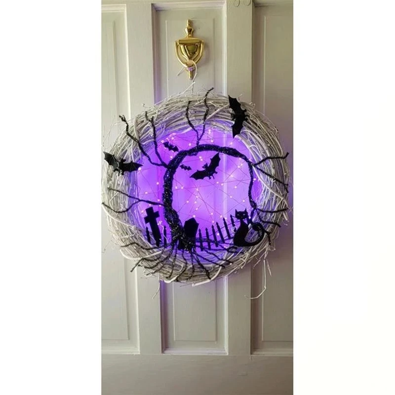 Венок на Хэллоуин со светодиодсветильник кой, венок с черной кошкой летучая мышь, кулон венок на Хэллоуин, украшение для дома вечерние праздничные принадлежности