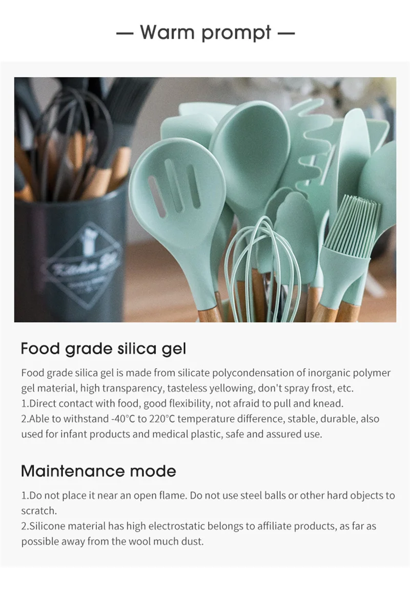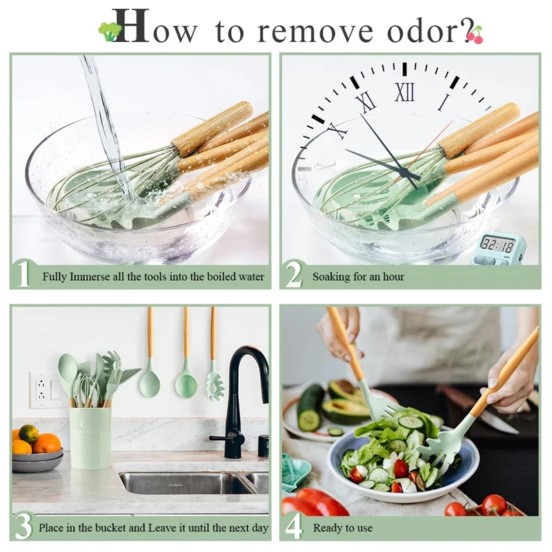 Внимание:1. Светильник и различные дисплеи могут привести к тому, что цвет товара на картинке немного отличается от реального. Допускается погрешность в измерениях +/- 1-3 см.2. Это нормально, что силиконовые продукты могут иметь некоторый запах, так как вулканизатор (своего рода катализатор, который играет важную роль в процессе формования) добавляется в сырье, чтобы сделать готовую продукцию более гибкой. Как правило, большая часть вулканизатора будет летучей после формирования, и остатки исчезнут в течение нескольких дней. (Вулканизатор не вредит здоровью людей)Небольшой наконечник для удаления запаха: Храните изделие в соленой воде около получаса, постирайте и высушите, запах исчезнет.3. Силиконовая посуда с деревянными ручками не может использоваться в посудомоечных машинах. После волдырей, тепловое расширение и сжатие будут тяжелыми.4. Мы тщательно проверим и упакуем перед отправкой. Если у вас возникнут какие-либо проблемы, пожалуйста, свяжитесь с нами, прежде чем оставлять негативные отзывы, пожалуйста, поверьте нам, мы постараемся сделать все возможное, чтобы помочь вам. Спасибо!Желаем вам приятных покупок!