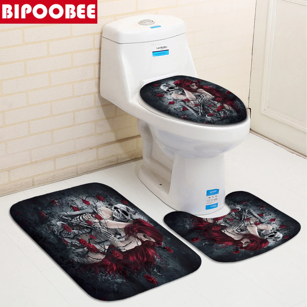 Занавеска для душа с черепом сексуальная девушка, 3D Скелет, коврики для ванны для влюбленных, чехол для унитаза, красные розы, Противоскользящие коврики, занавески для ванной комнаты, набор s
