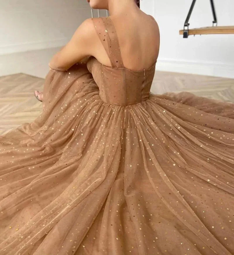 Блестящее платье для выпускного вечера из тюля с принтом "Звездное звёздное" платье длиной ниже колена на тонких бретельках с открытой спиной для девушек вечернее коричневое платье для выпускного вечера
