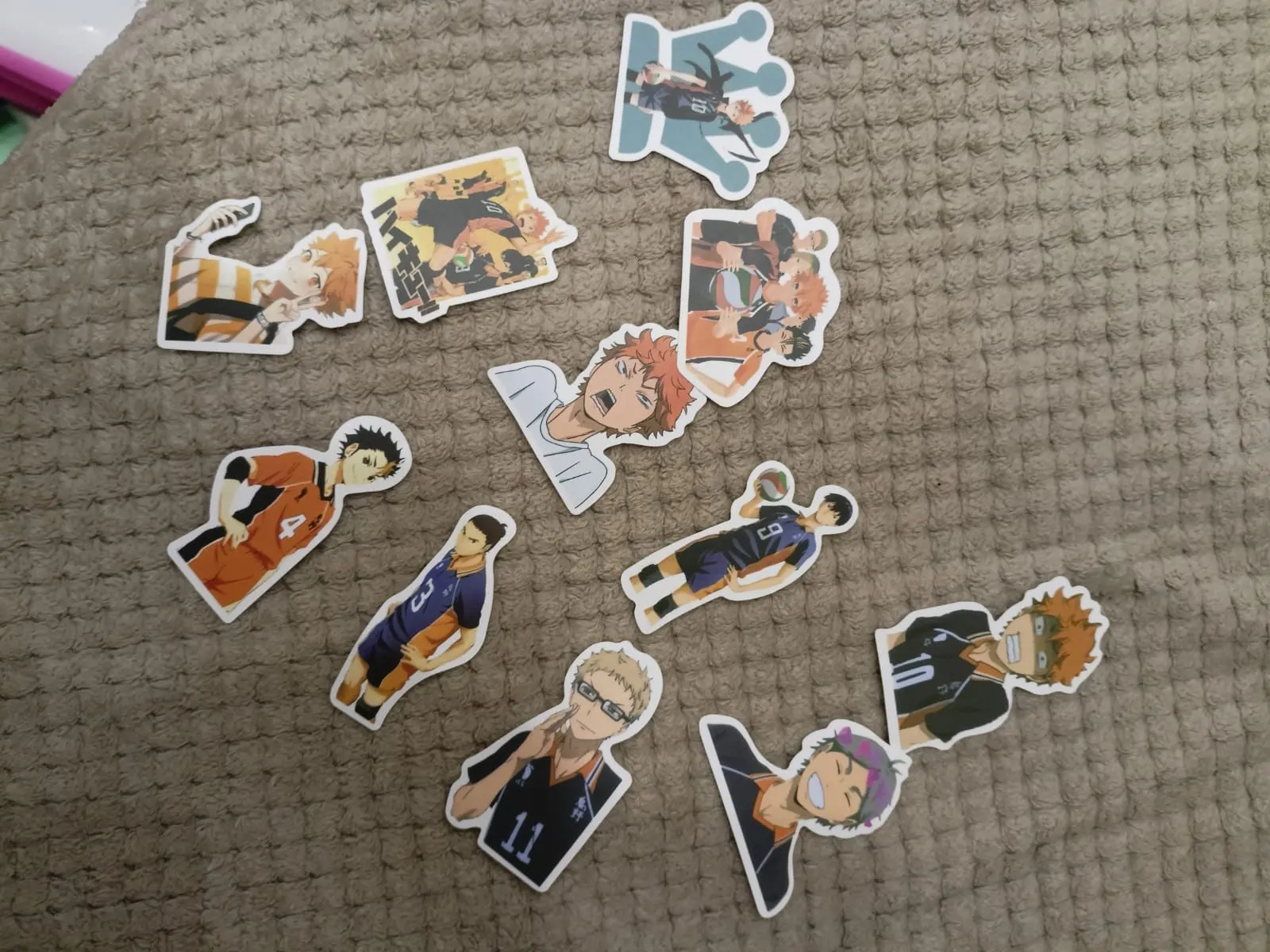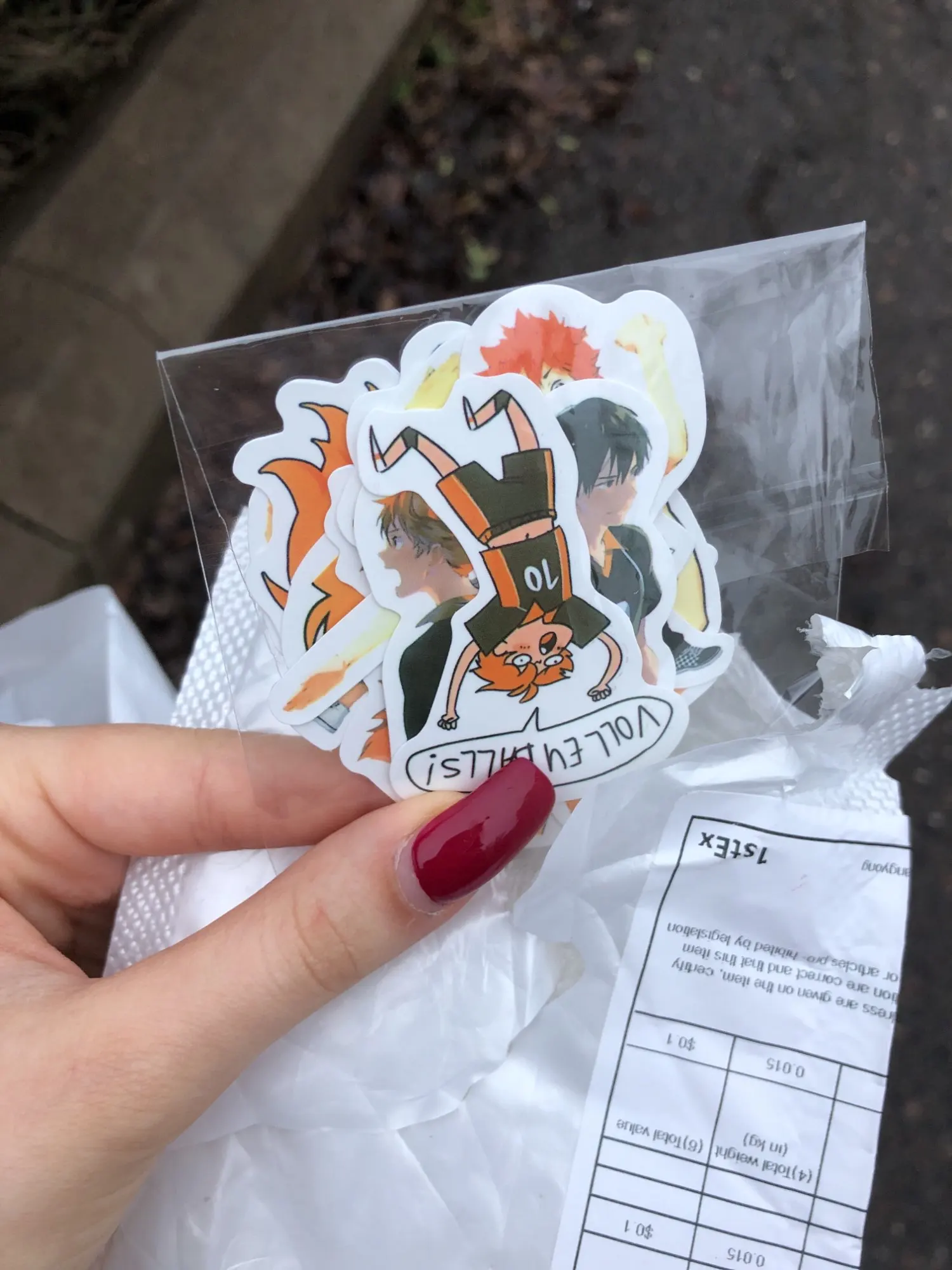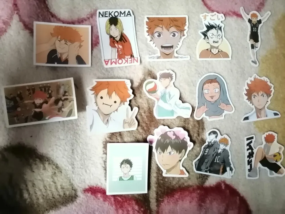 Заказ пришёл в срок. Все 50 штук. К моему несчастью, там не было ни одного Асахи. Я посчитала и вышло: Хината 22, Кагеяма 4, Кагеяма и Хината 7, Нишиноя 6, Бокуто 2, Ойкава 2, Цукишима 2, Тендо 1, Кенма 1, Девиз Карасуно 1, Вся команда Карасуно 1, Танака 1 шт. Наклейки яркие, неразмытые, красивые. Товаром довольна, но была бы счастливее, если бы там был хоть один Асахи. С продавцом не общалась.