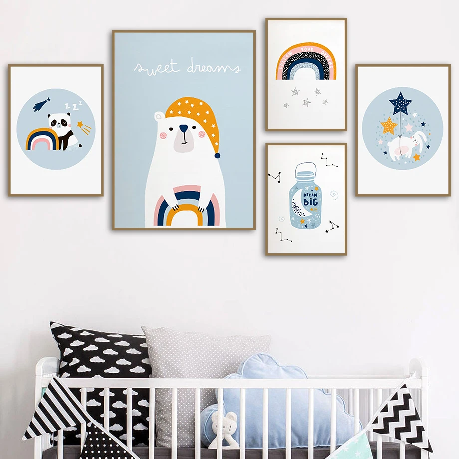 Милый медведь, кролик, панда, кот, радуга, Луна, настенная Картина на холсте, скандинавские плакаты и принты, Мультяшные настенные картины, декор для детской комнаты