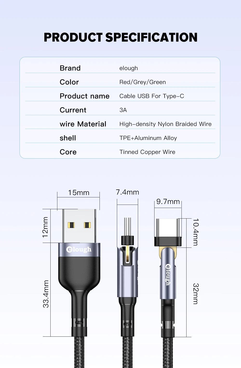 Кабель зарядный Elough с USB на USB Type-C, вращение на 180 градусов