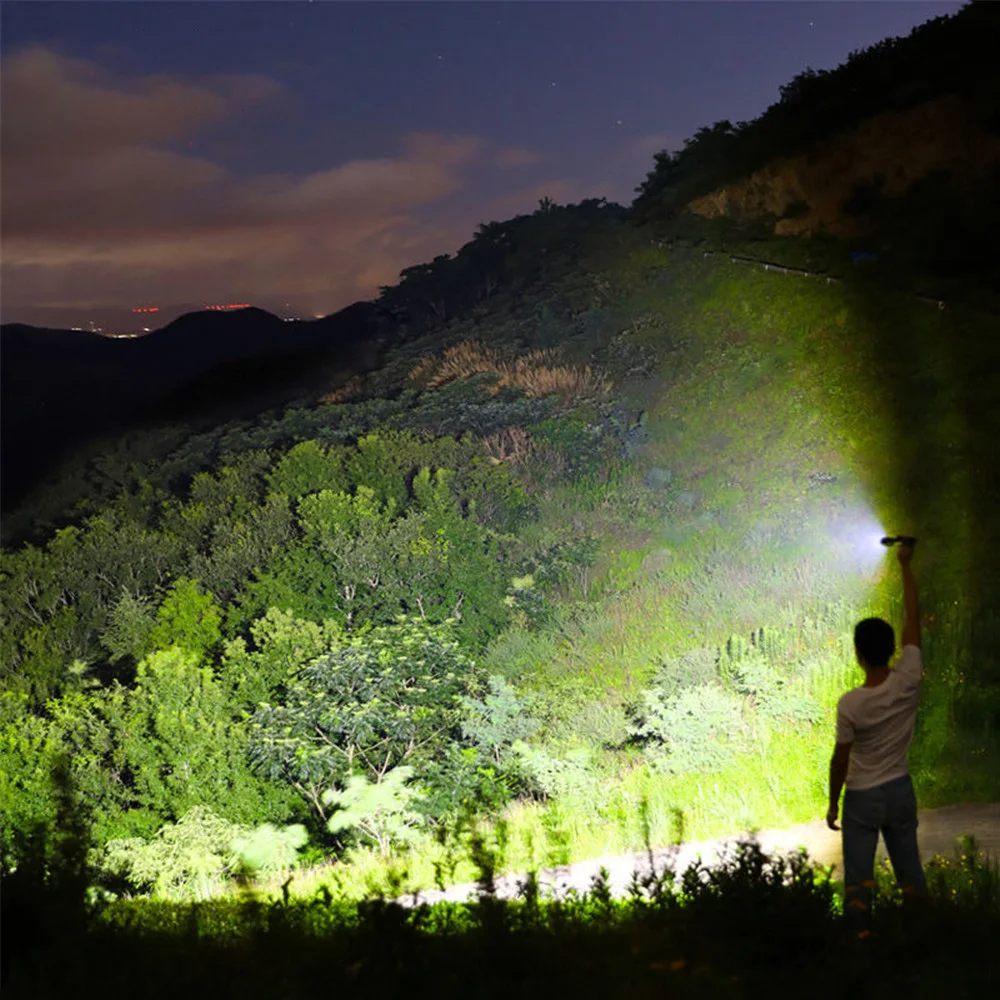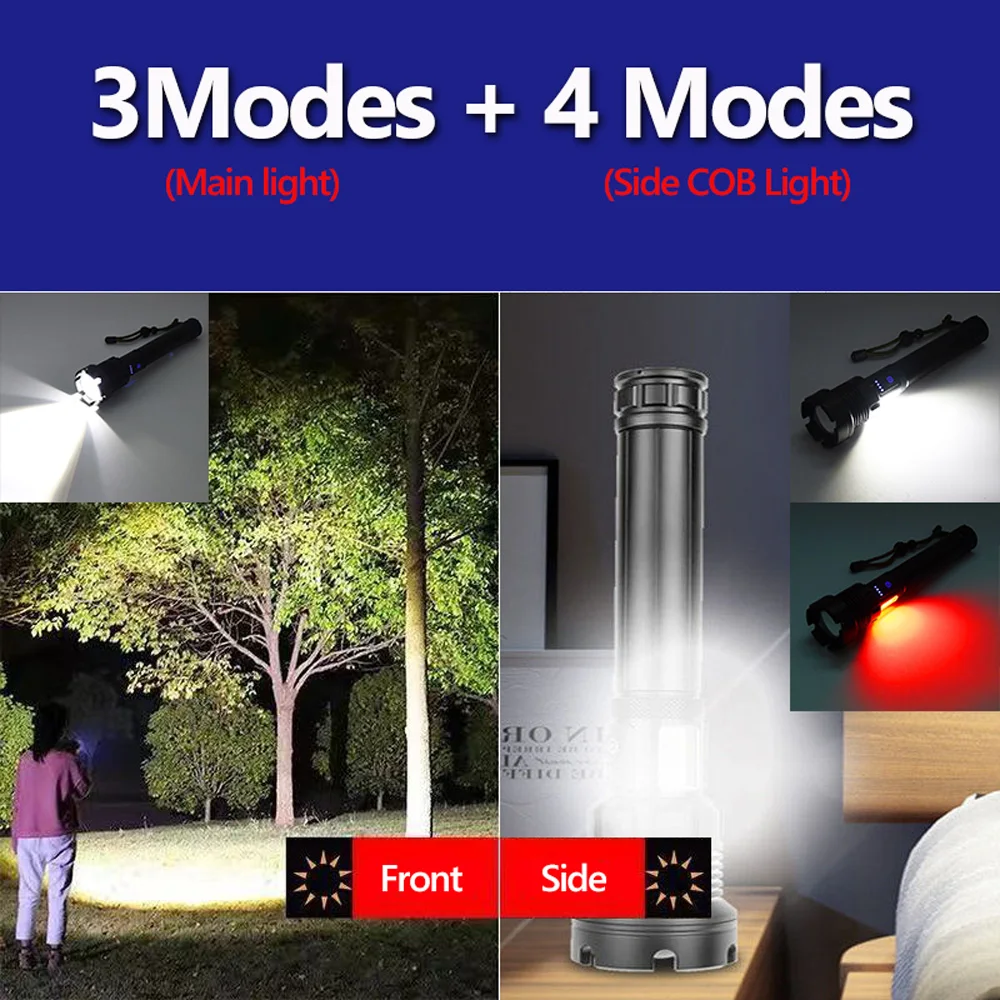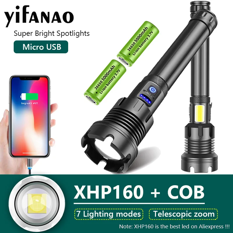 【Супер яркий светильник для вспышки 】 светодиодный светильник для вспышки встроенный усовершенствованный светодиодный светильник XHP160, максимальная яркость до 100000 люменов, легкий светильник для всей комнаты или Фокусировка на предметах до 1000 футов! Подходит для домашнего и наружного использования. Может использоваться в качестве тактического фонарика на дальние расстояния.【 7 режимов и обновление бокового освещения 】наш светодиодный фонарик имеет 7 режимов освещения, 3 режима для основного освещения (высокий/низкий/Стробоскоп) при коротком нажатии на переключатель. 4 режима для обновления бокового освещения (высокий/низкий/красный стробоскоп), быстро дважды нажмите переключатель, затем короткое нажатие, чтобы изменить режим. 2 способа выключения: 1. Нажмите переключатель, чтобы изменить режим яркости и выключить в цикле. 2. Нажмите и удерживайте переключатель 2-3 секунды для прямого выключения.【Зарядка через USB и внешний аккумулятор 】 перезаряжаемый фонарик USB питается от 2*26650 перезаряжаемых литиевых батарей, которые используется для до 5 часов каждый раз. Более того, наш светодиодный фонарик имеет функцию выходной мощности, поэтому вы можете использовать его в качестве внешнего аккумулятора для зарядки ваших устройств с помощью usb-кабеля для передачи данных, не нужно беспокоиться о отключении питания во время путешествий на открытом воздухе.【Масштабируемый и водонепроницаемый 】изготовлен из высококачественного алюминиевого сплава, светильник вспышки прочный и водостойкий, позволяет удобно использовать в различных экстремальных погодных условиях. Используйте Регулируемый зум, чтобы сфокусироваться на отдаленных предметах или увеличивать его, чтобы светильник поднимался на широкую область, просто нажмите на передний светильник для регулировки.【Комплектация: вы получите: 1 светодиодный фонарик, 1 usb-кабель, 1 ремешок, 2 пластиковых трубки(Если вам нужен аккумулятор, вы должны выбрать правильную посылка с батареей)