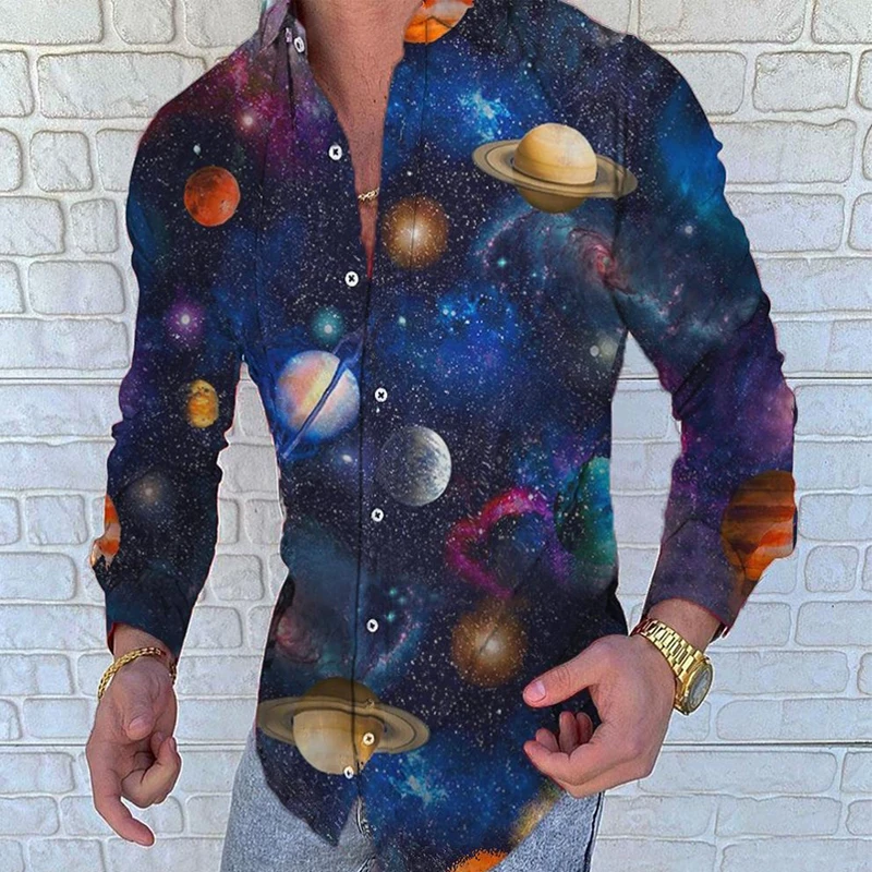 Мужская приталенная рубашка, Повседневная рубашка с длинными рукавами, пуговицами и отложным воротником, с 3D принтом, осень 2019