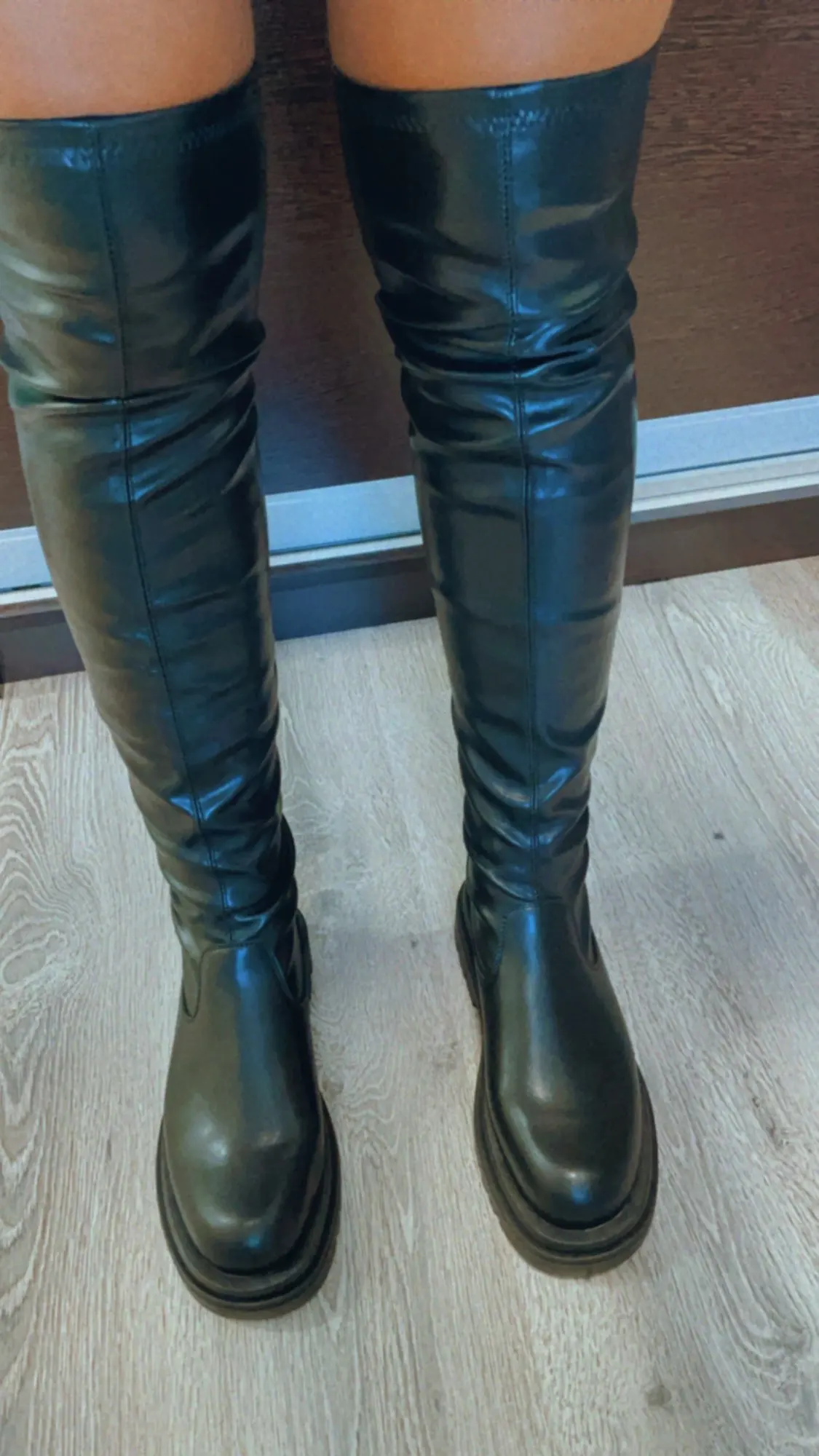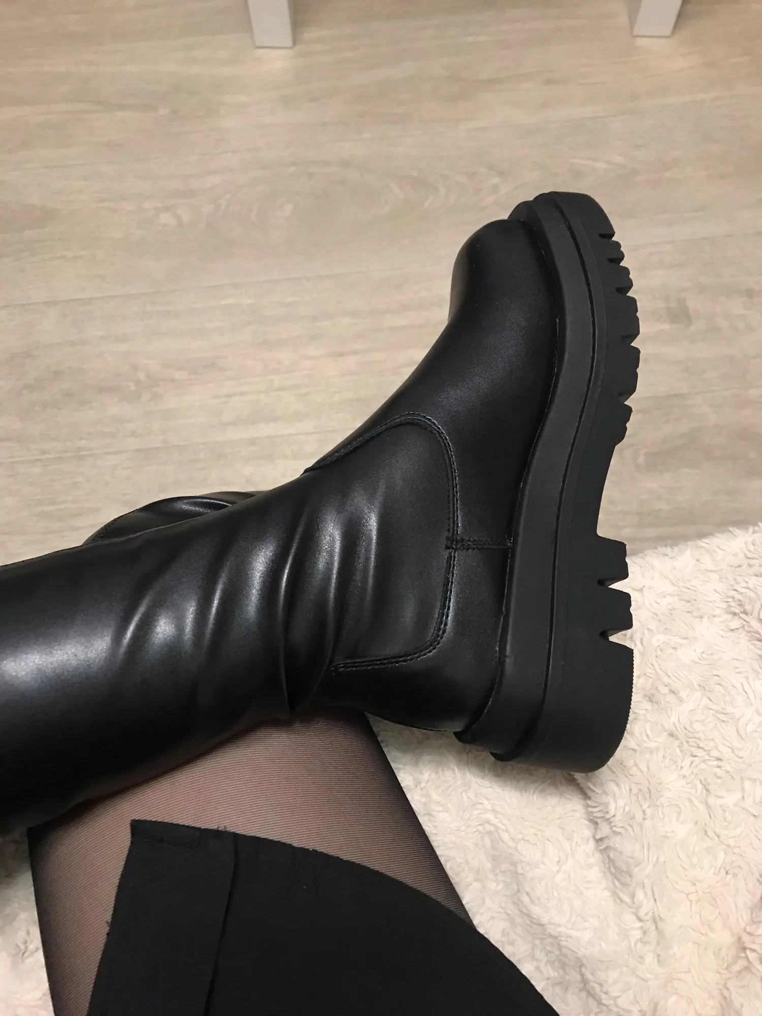 Новые женские высокие сапоги; Модные зимние женские сапоги до бедра; Сапоги выше колена на не сужающемся книзу массивном каблуке; Женская обувь; Модные женские сапоги