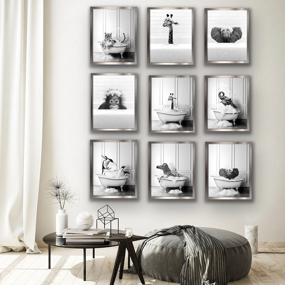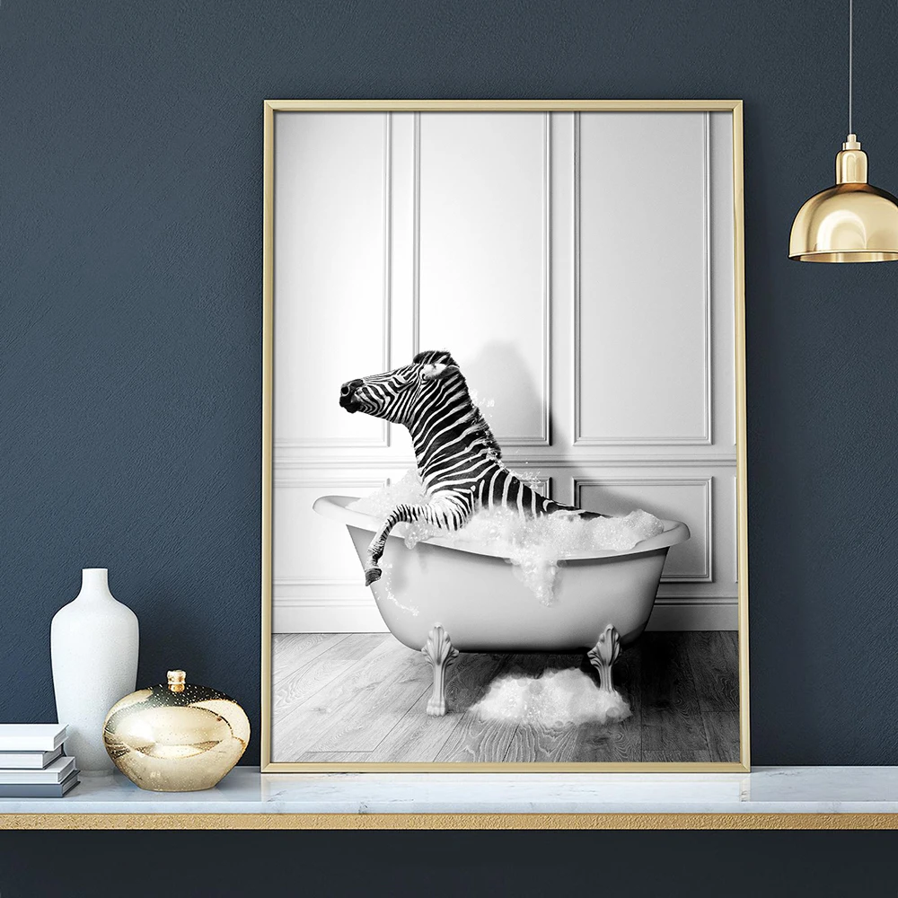Забавный холст с животными для ванной комнаты, Зебра, слон, тигр, жираф, принты и плакат, милое искусство для ванной, картина на стену, декор унитаза