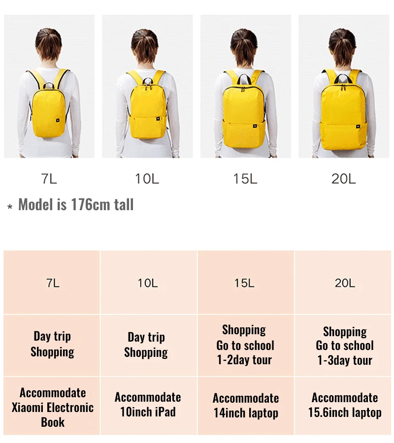 Маленький размер, дизайн большой вместимости, молодой и красочный, прогуляйтесь по городу и туристические достопримечательности, свободно Путешествуйте по всему миру. Для улицы и досуга, это круто. Упорядоченная жизнь начинается сейчас и приятного времяпрепровождения.Название бренда:XiaomiОсновной материал: полиэстерЦвет: черный, темно-синий, оранжевый, синийВес: 7л: 0,11 кг/10л: 0,17 кг/20л: 0,29 кгРазмеры: 7L: 30,3*20,4*11,5 см10L:34*22,5*13 см20л: 41,6*29*15,4 смСистема переноски: плечевой ремень ArcuateИнтерьер: внутренний отсекИнтерьер: внутренний карман со слотом