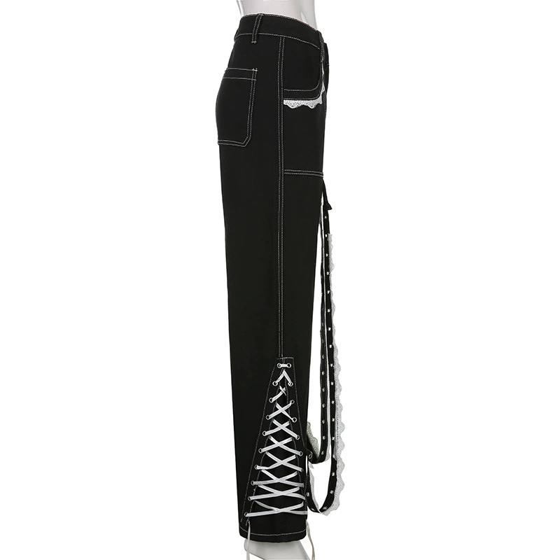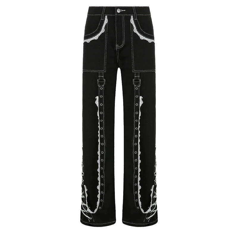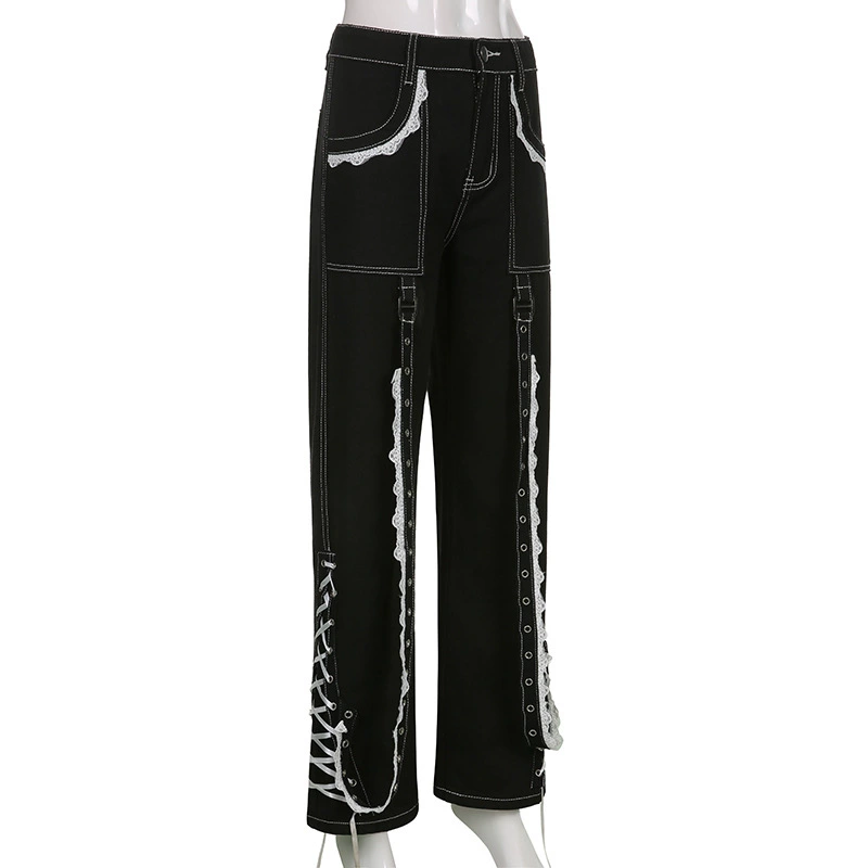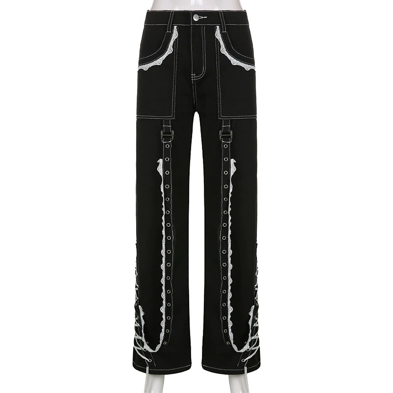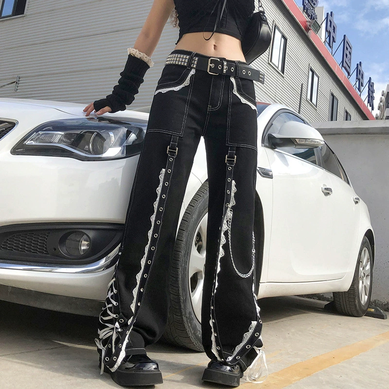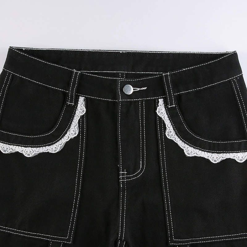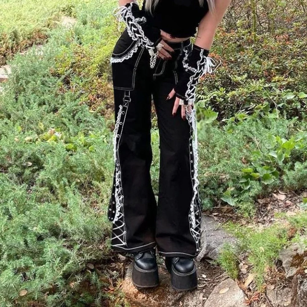 Джинсы женские кружевные с заниженной талией, милые черные брюки-карго в готическом стиле, с застежкой-молнией и карманами, академические джинсы в стиле панк для косплея, 90-х