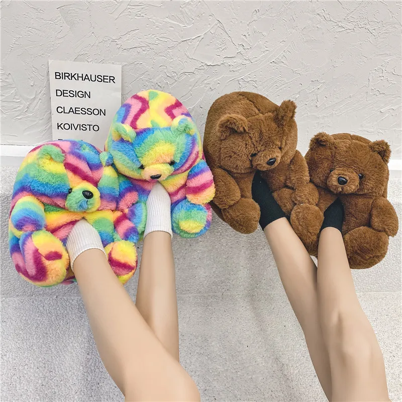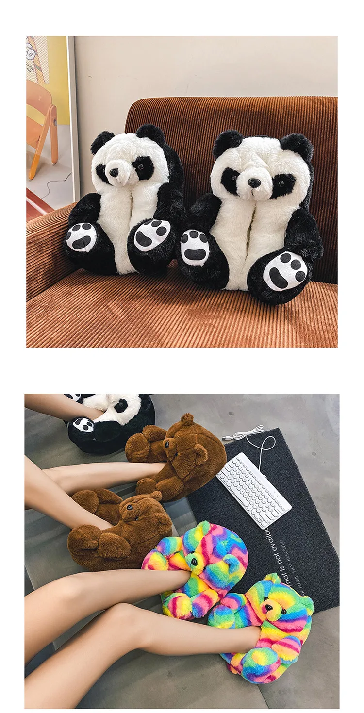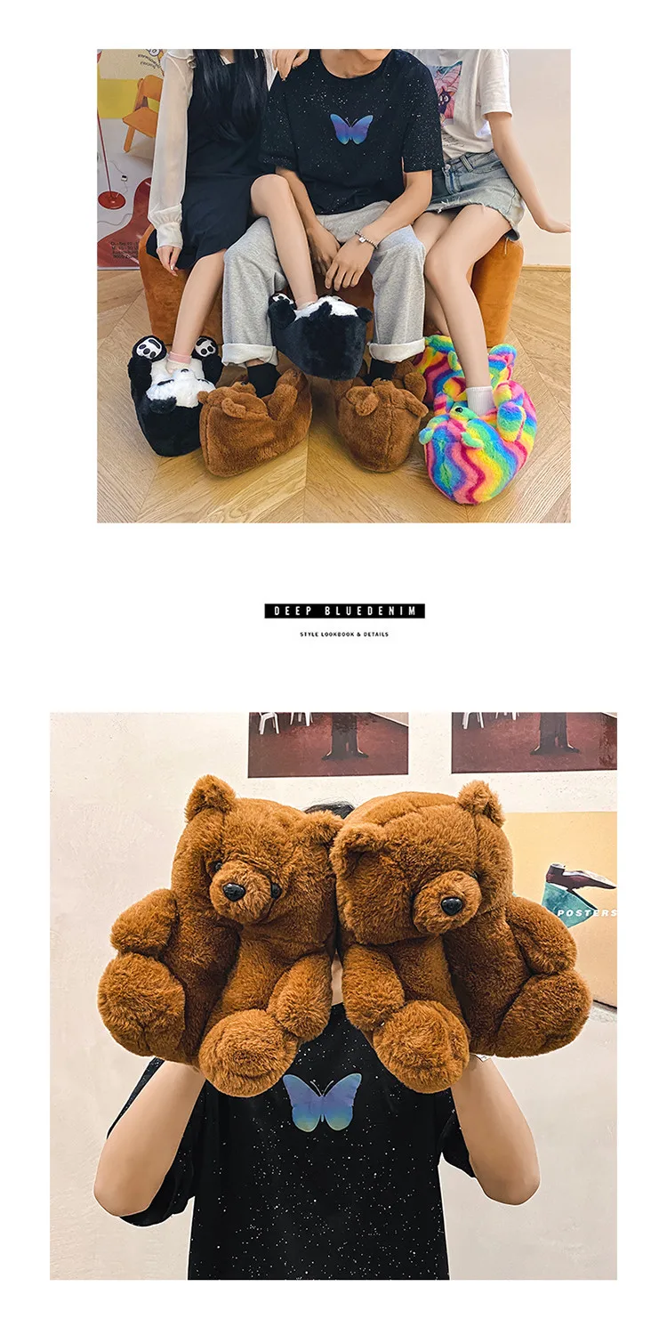 Новинка 2021, женские домашние мягкие Нескользящие симпатичные Тапочки из искусственного меха, зимняя теплая обувь, женские плюшевые тапочки с мультяшным медведем
