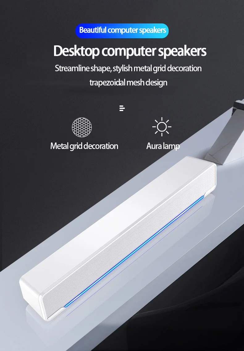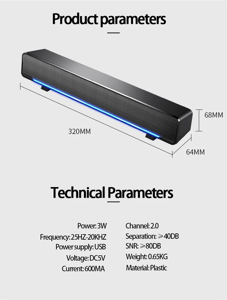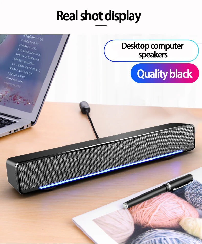 Это тонкий динамик с питанием от USB; Стабильный и без потерь басовый звуковой эффект и окружающие стереозвуки приносят вам прекрасную музыку. С 3,5 мм аудио разъем, он идеально подходит для настольных ПК, ноутбуков, ТВ, смартфонов, планшетных ПК, PC, MP3, MP4 и многое другое. Этот динамик с питанием от USB является энергосберегающим и экологически чистым, безопасным и надежным. Высококачественный пластиковый материал, легкий и портативный, удобно брать. Классический черный внешний вид делает его красивым и сочетающимся с стилем украшения вашей комнаты. Регулятор громкости с синим светодиодный светильник облегчает работу и делает динамик более изысканным.