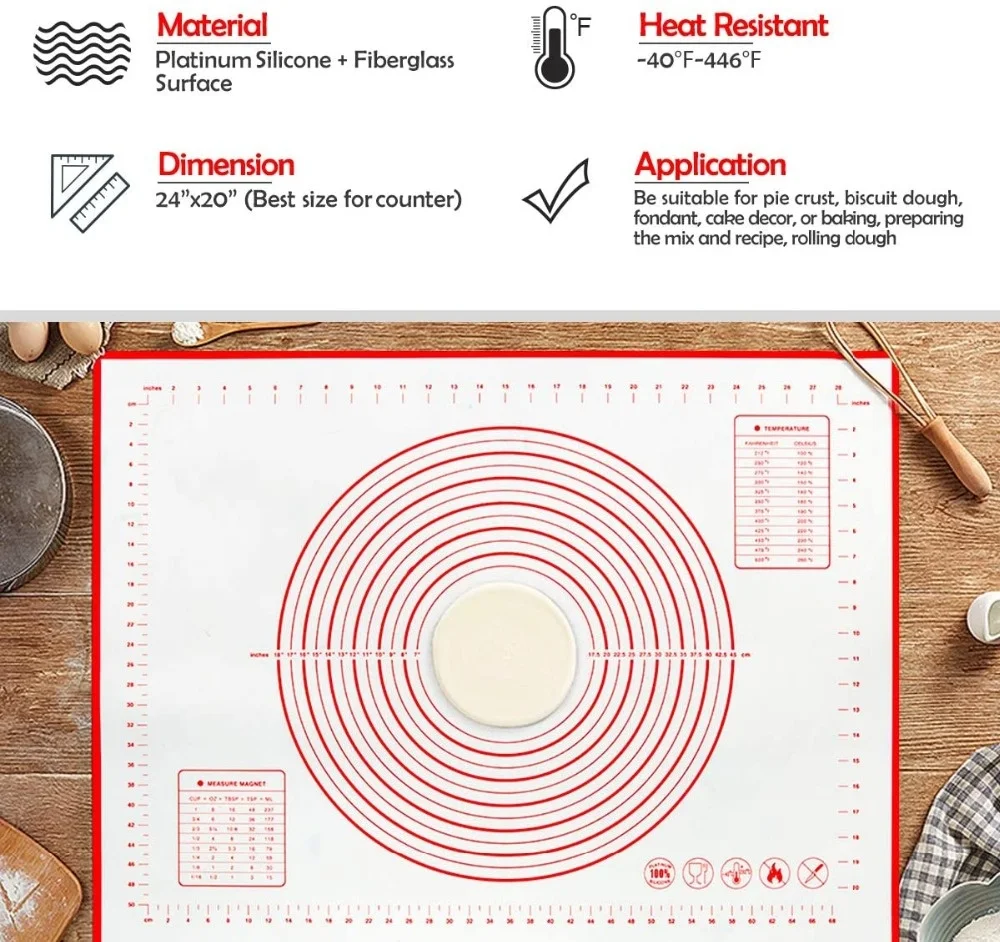 Очень трудно двигаться, когда вы раскатываете тесто и всегда сохраняете стабильность на столе. Супер Кухонный коврик также идеально подходит для выпечки, прилавка, коврик для пиццы, коврик для размещения, детский коврик и так далее.