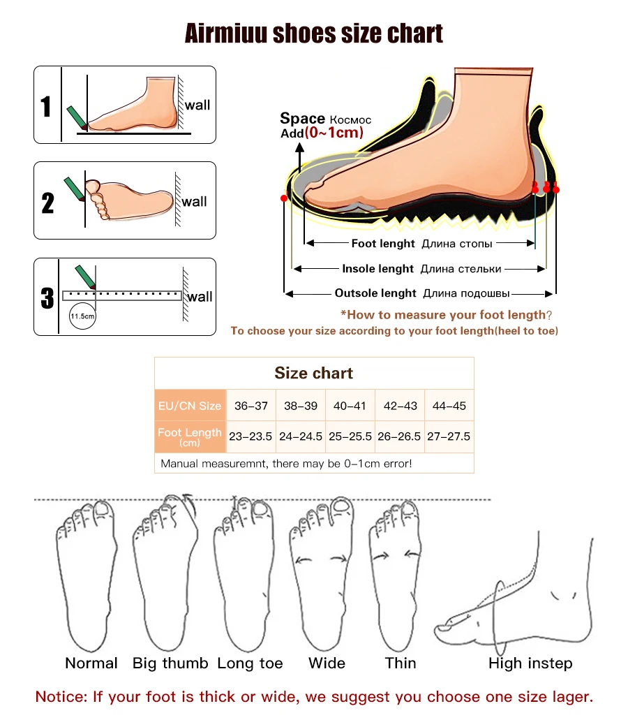 Сначала стойте на ногах, чтобы измерить самую длинную часть, а затем используйте данные о длине стопы, чтобы узнать соответствующий размер обуви в таблице размеров ниже.1. Длина стопы в таблице размеров означает использование этой длины стопы для выбора подходящего размера. Длина стопы не длина стельки, не длина подошвы.2. Пожалуйста, выберите размер в соответствии с длиной Вашей стопы (Не выбирайте размер в соответствии с вашим обычным размером обуви!)3. Из-за различных настроек дисплея и угла съемки цвет может немного отличаться от реального.