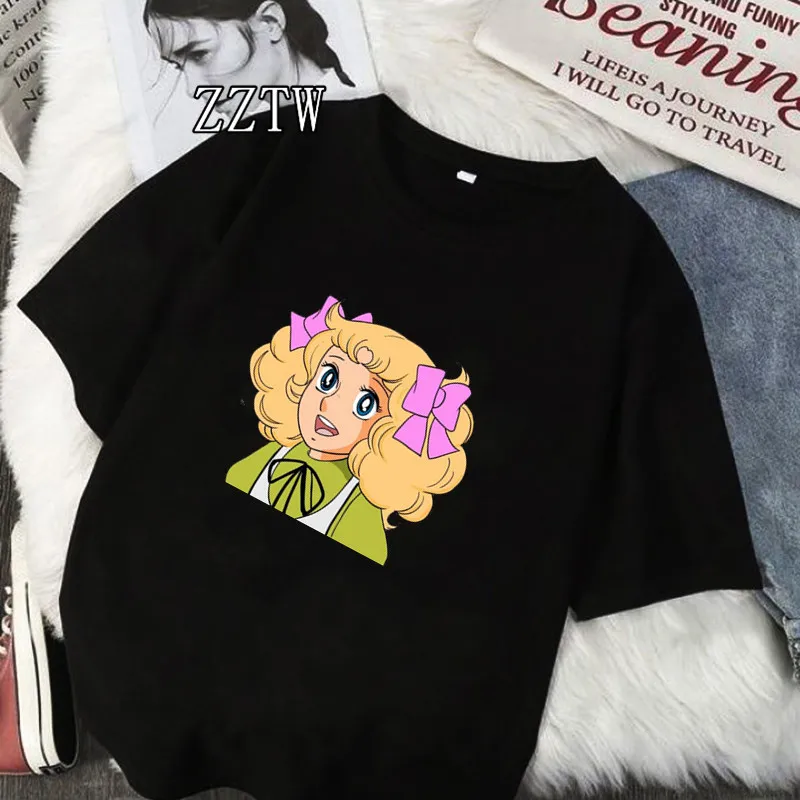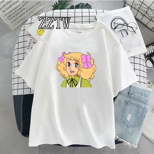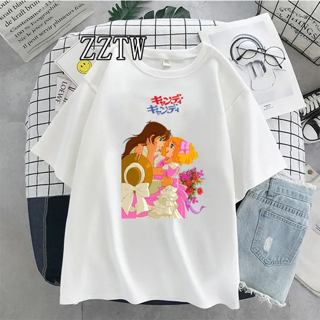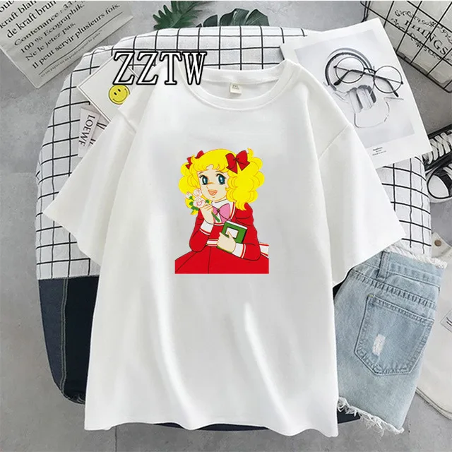Футболка женская винтажная в стиле аниме, топ с коротким рукавом и круглым вырезом, с мультяшным японским принтом карамельных цветов, уличный подарок для девушек, 70