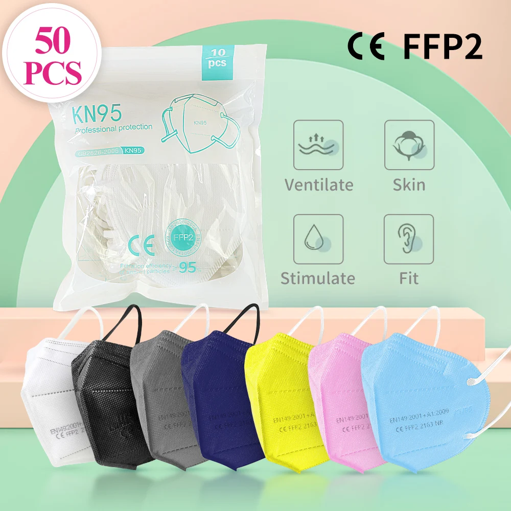 Маска FFP2 KN95 5 слоев, респиратор для взрослых, фильтр KN95, 7 цветов, сертификация CE, 50 шт.