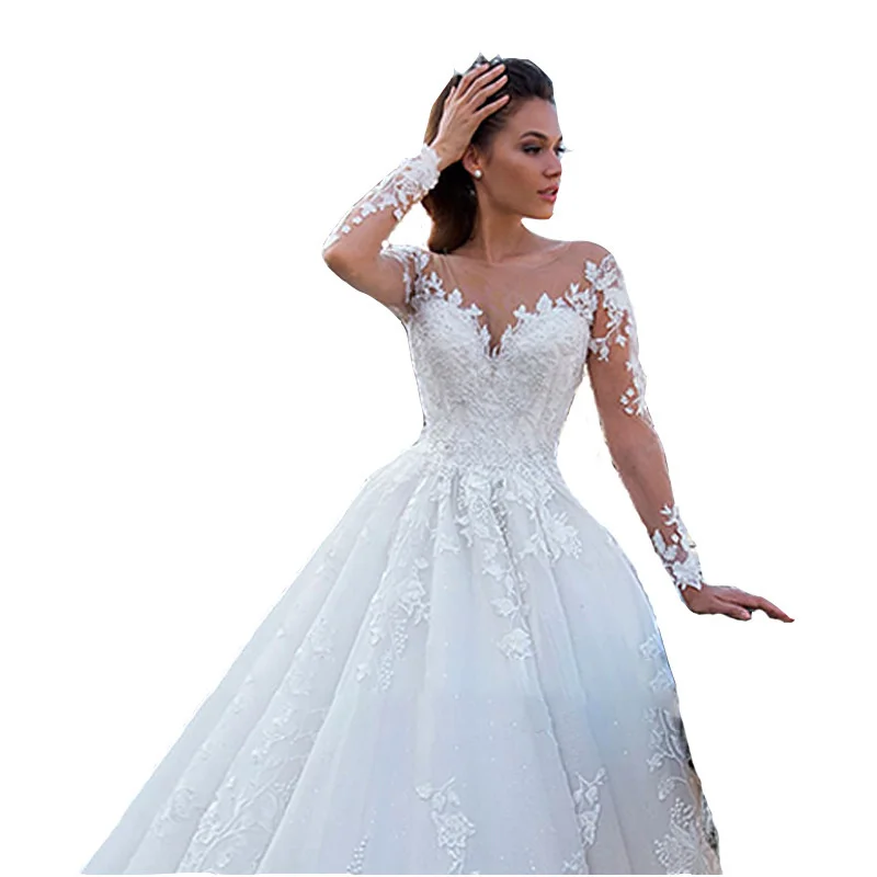 Кружевное свадебное платье с длинным рукавом и шлейфом, классическо...