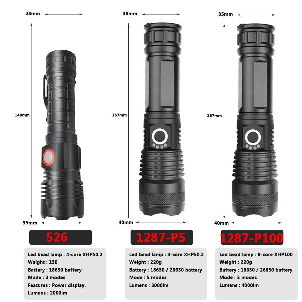 1. Название бренда: Litwod2. Название модели: 1287 3. Количество: 1 шт.4. Светодиодные бусины: XHP100 5. Срок службы лампы: 100000 часов6. Цвет Фонарика: черный7. Излучаемый Цвет: белый светильник8. Переключатель: Кнопочный переключатель(5 режимов)9. Чехол Материал: Прочный авиационный алюминий10. Порт зарядки:Микро-usb15. Расстояние освещения: 250 метров16: светодиодный срок службы: более 100000 часов