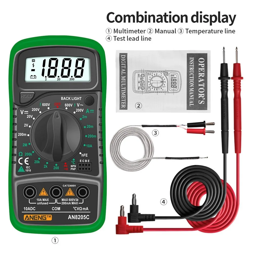 ANENG AN8205C цифровой мультиметр AC DC Амперметр Вольт Ом тестер Портативный ЖК-дисплей измеритель PNP NPN Триод HFE K Тип термопара