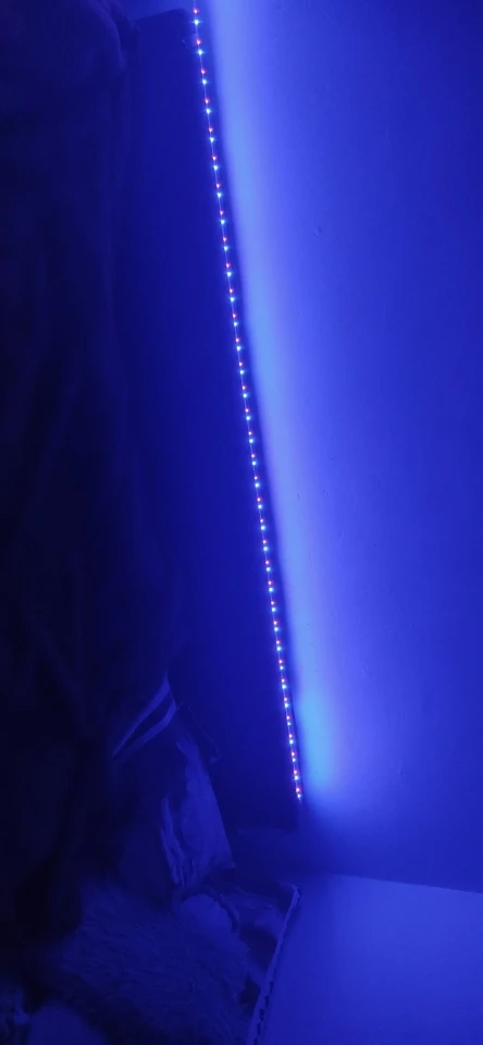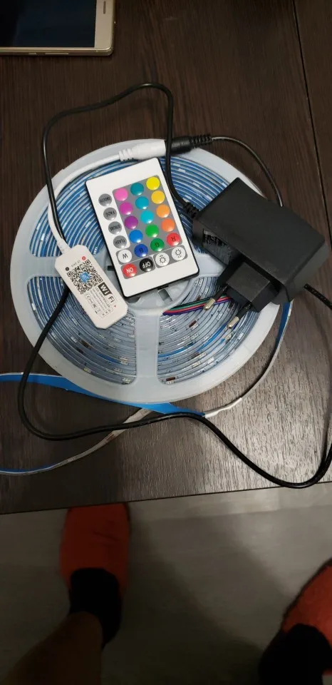 хорошая диодная РГБ лента. с обратной стороны двусторонний скотч. управляется либо с пульта, либо с телефона. доехала очень быстро.