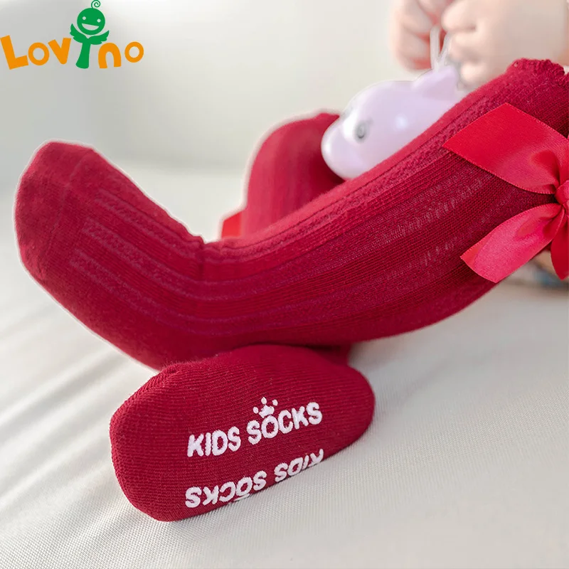 3 парыЛот Детские носки с бантом осень Новорожденные девочки дети на Рождество зимние Нескользящие хлопковые принцессы до колена длинные носки