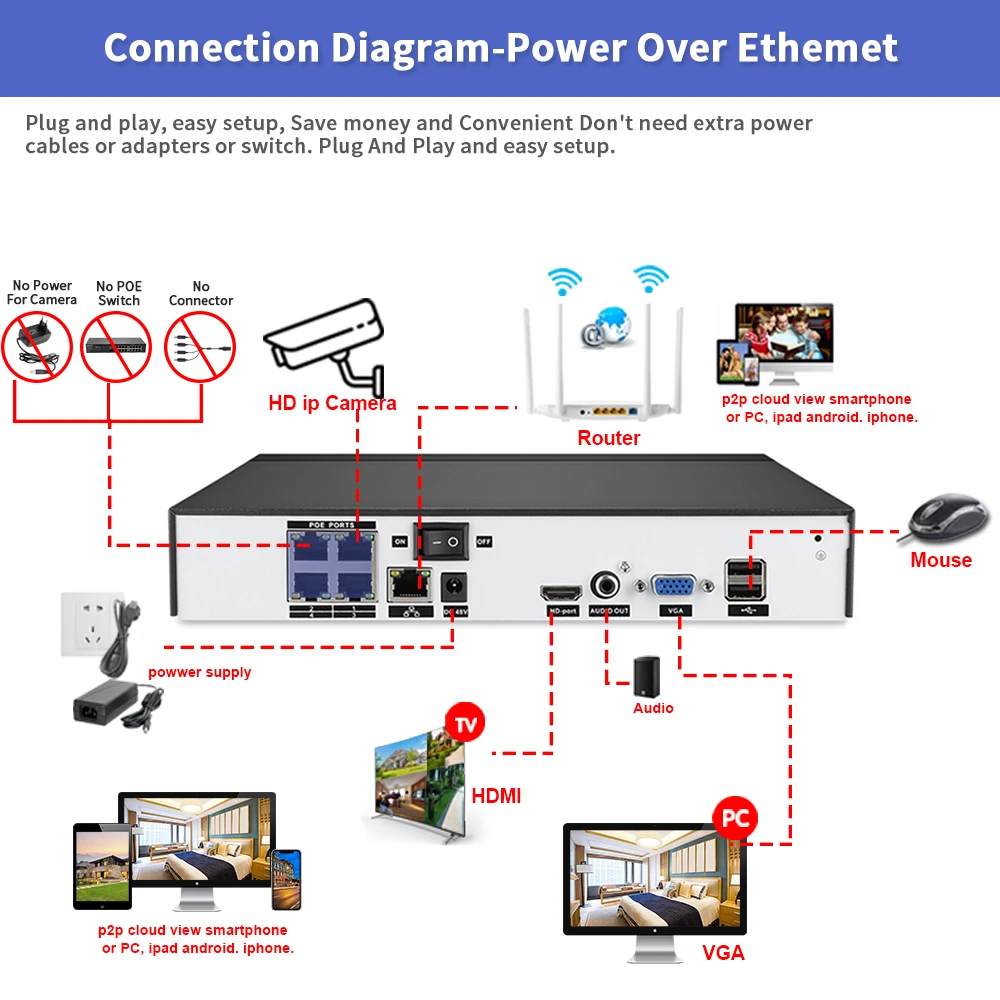 Нет дополнительных кабелей питания или адаптеров, просто подключив ip-камеру к NVR с помощью одного кабеля, вы можете легко завершить установку без знания о компьютере или сети и начать наслаждаться супер простым мониторингом среди вашего смартфона, планшета или ПК.