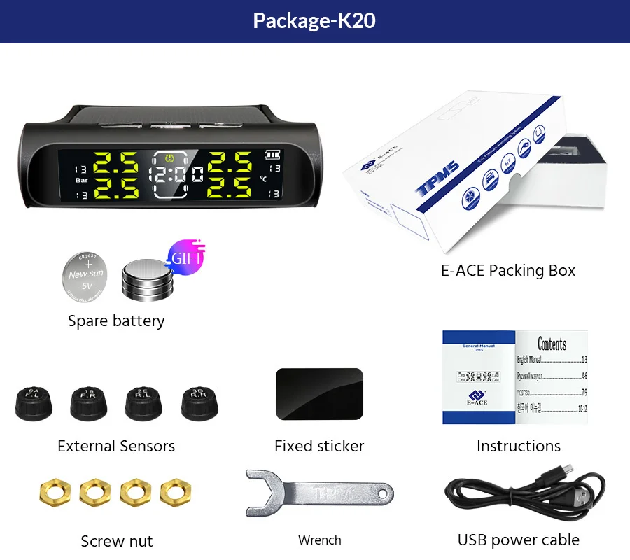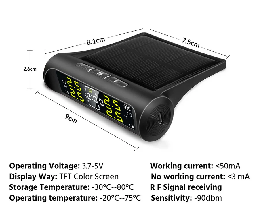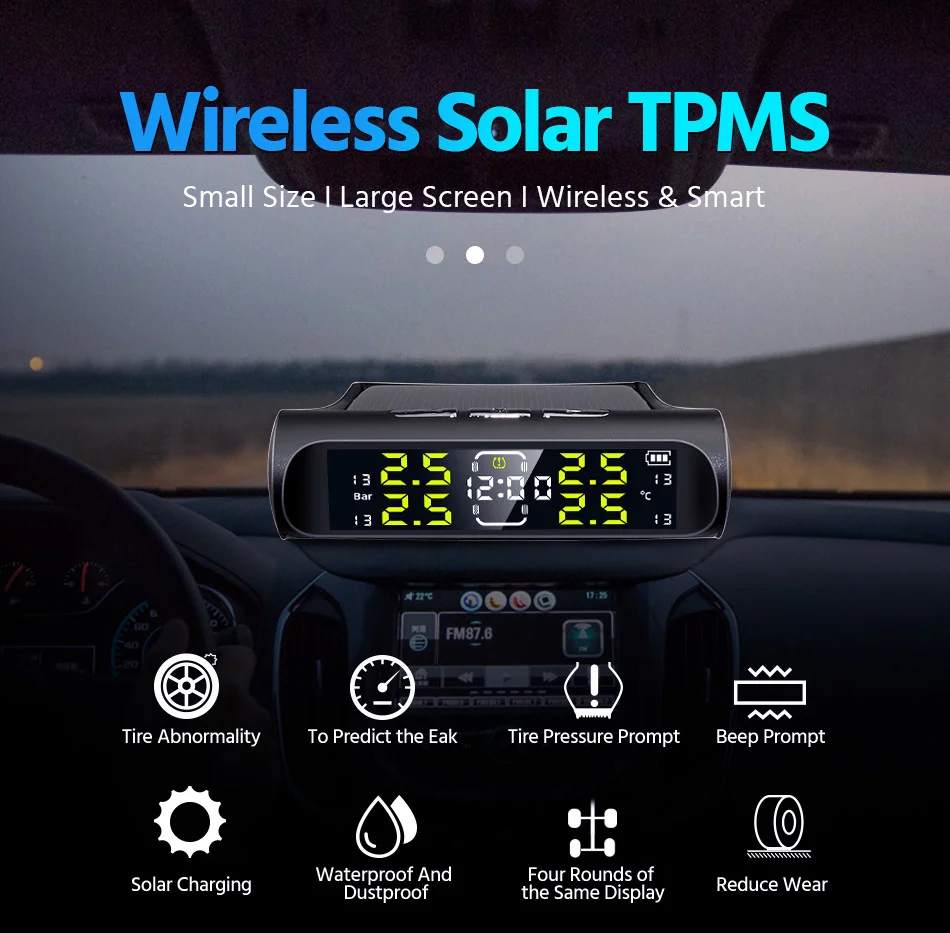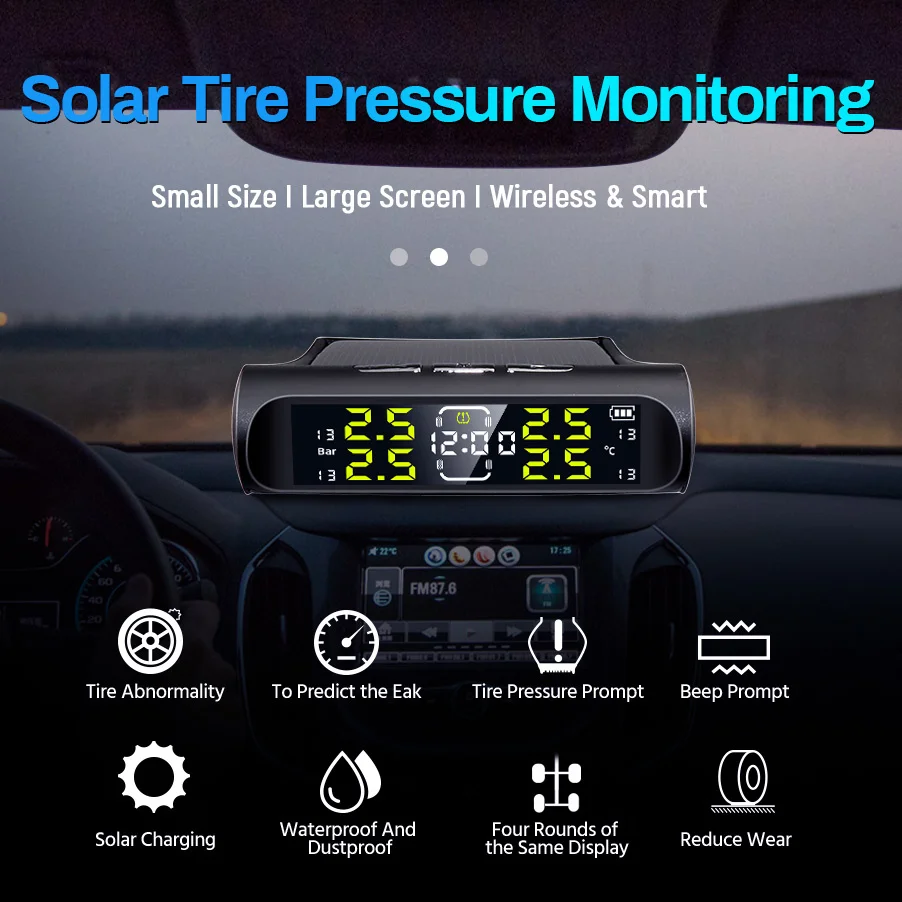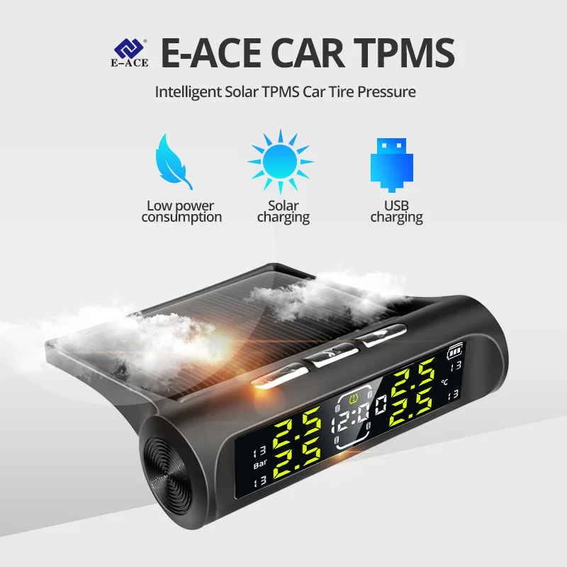 Электронные часы, автомобильные датчики давления в шинах TPMS, ЖК-экран, солнечная энергия, USB-порт, автомобильные системы охранной сигнализации