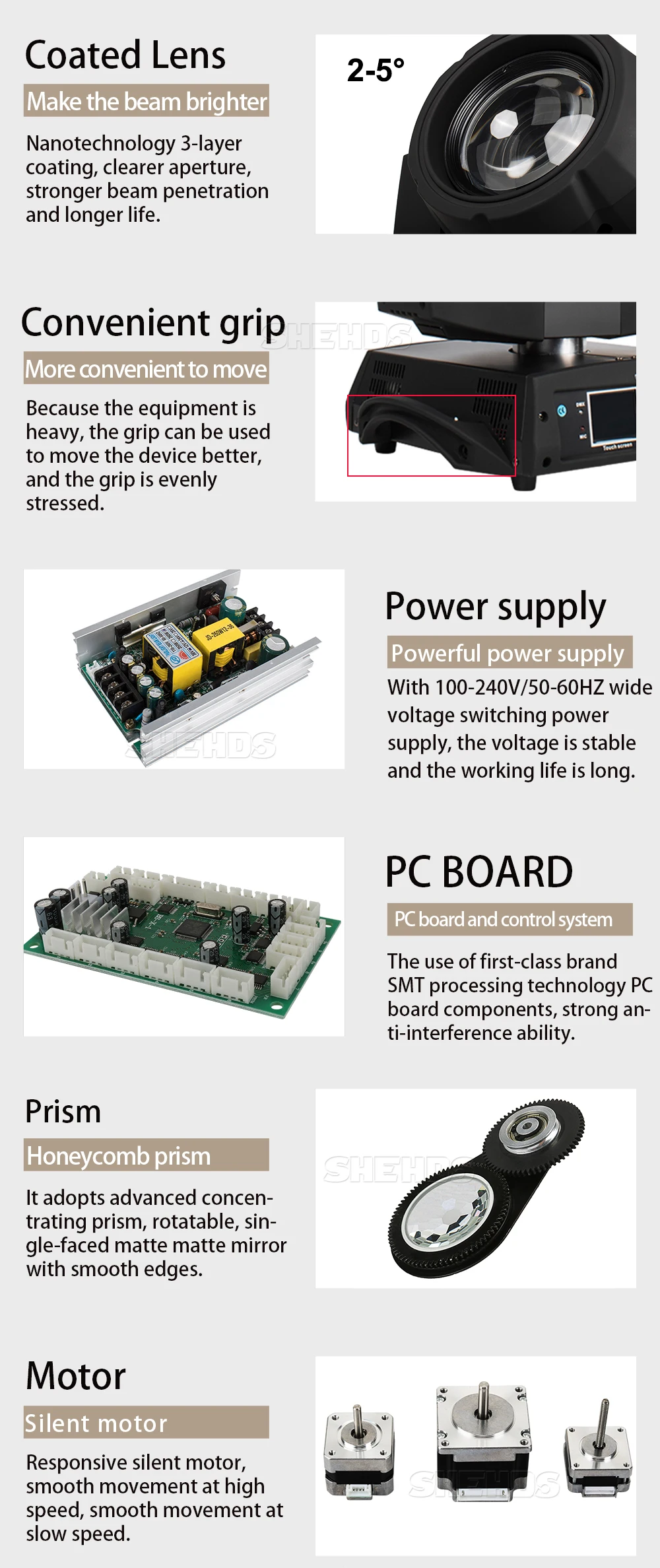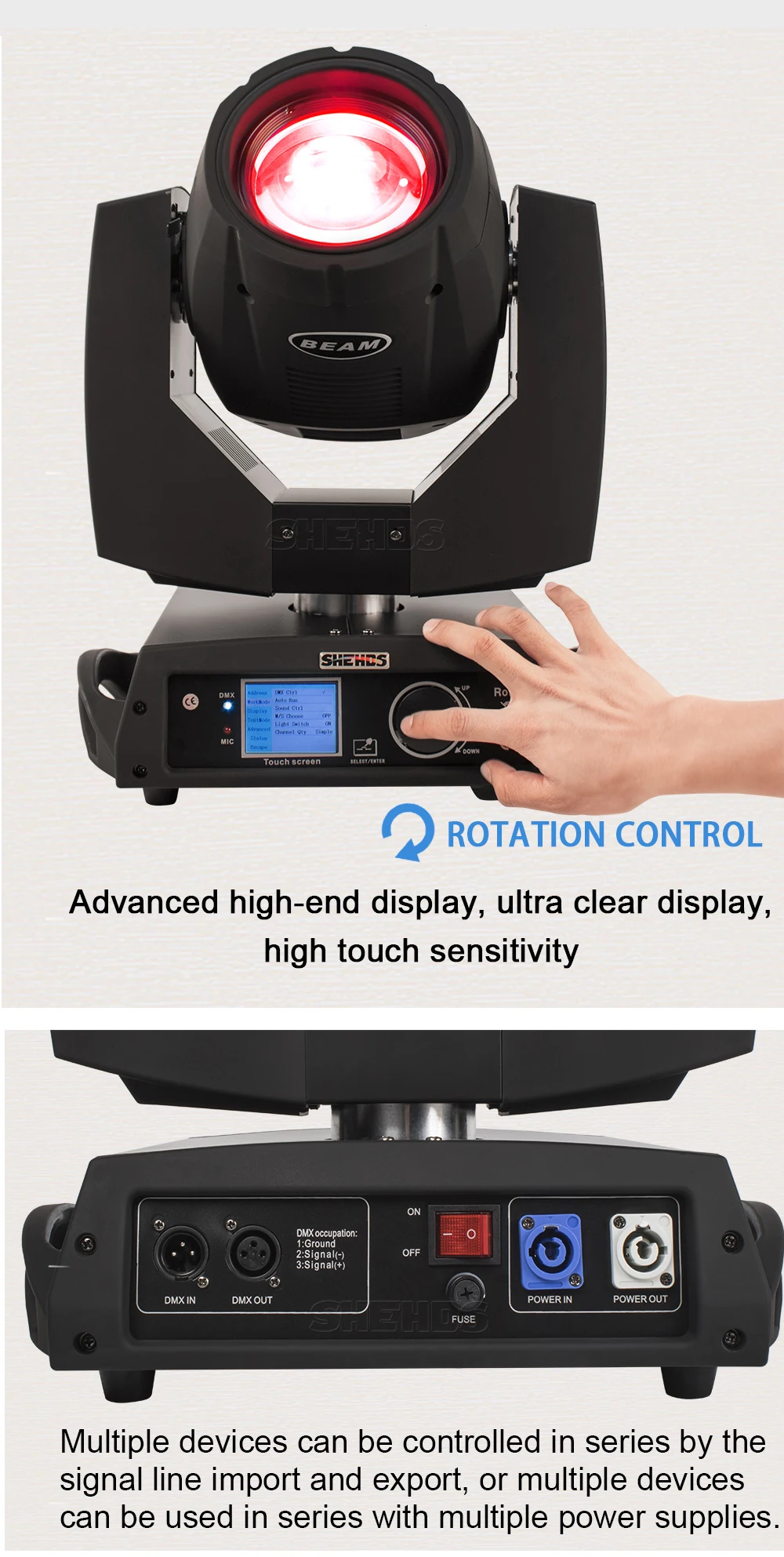 * Режимы управления:DMX512, Авто запуск, звуковое действие, стробоскоп, автономный и мастер/раб, с богатой передовой встроенной программой