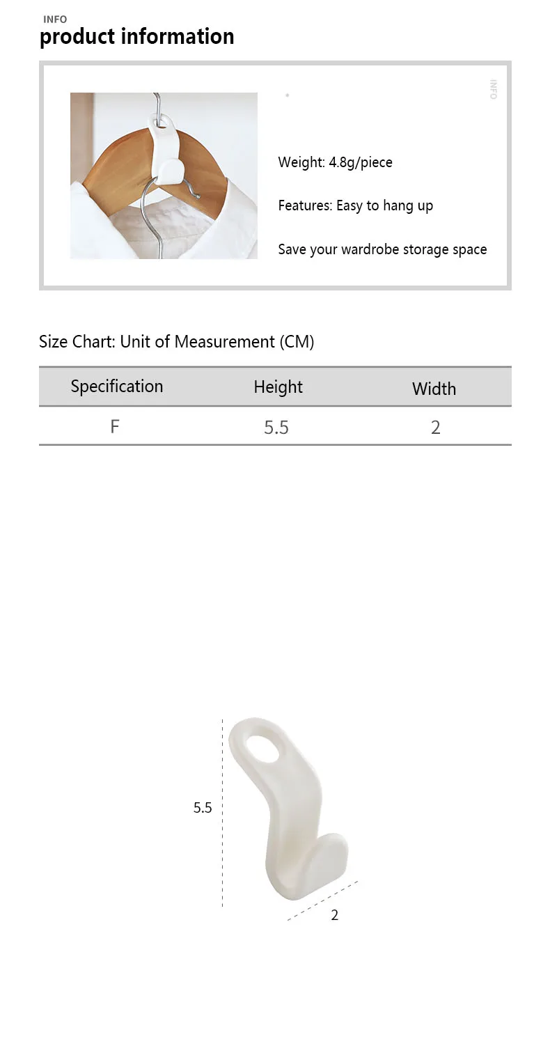 Наименование: вешалка для гардероба, соединительный крючок, шесть упаковокРазмер: около 6*2 смМатериал: полипропиленКраткое описание: Соединительный крючок для вешалок для гардероба, шесть упаковок, соответствие японского цвета, хороший Подшипник нагрузки, не легко деформируется, экономя пространство для хранения вашего гардероба