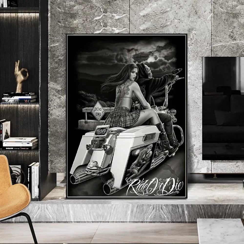 Черно-белый граффити мотоцикл Скелет Райдер Картина на холсте сексуальные татуировки для девочек плакаты и печать на стене Искусство Декор без рамки